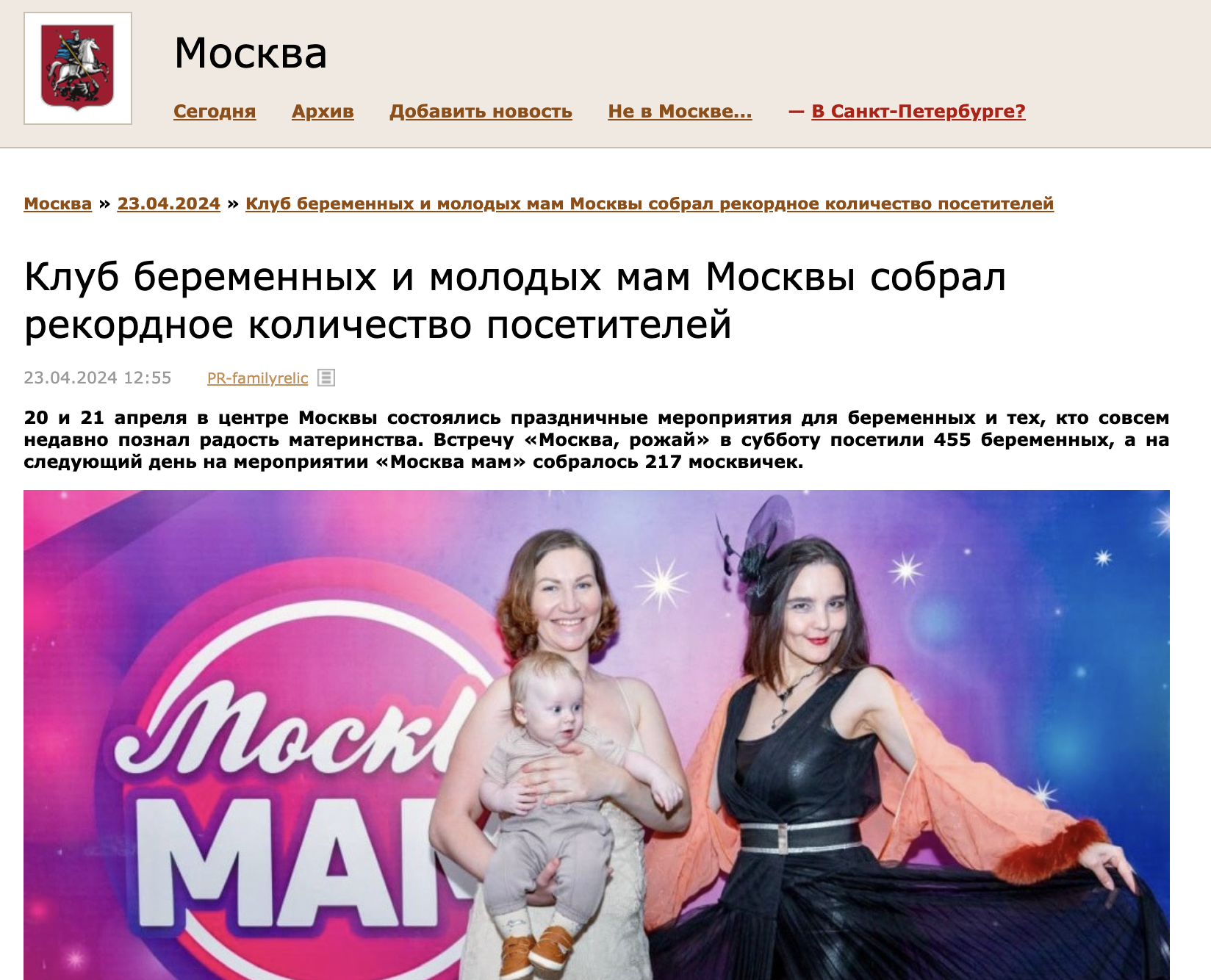 Отчет для партнеров мероприятия | | | | Девичник беременных Москва, рожай! | 20 апреля, гостиница Золотое кольцо 5* | | | Побит очередной рекорд посещаемости! | 20 апреля наше яркое и масштабное мероприятие посетило более 450 беременных! По опросу гостей встреч, проведенному в присутствии комиссии из партнеров, 95% девушек пришли к нам в первый раз. | | | | Фотозона | На фоне пресс-вола гости делали памятные фото | | | | По уже сложившейся традиции по итогам мероприятия мы получили солидный набор публикаций от изданий: | | | | Лекторий | Участницы мероприятий получили огромное количество полезной информации на самые актуальные темы, касающиеся течения беременности, восстановлении после родов и первом периоде жизни малыша. Все спикеры подготовили интересные и познавательные лекции и вызвали среди участниц оживленную дискуссию. На мероприятии прочитали 11 лекций на каждой из 2-х сессий. | | | | Мини-выставка товаров и услуг | Во время всего мероприятия работала выставочная зона, на которой можно было посмотреть и протестировать товары для самых маленьких и подробнее узнать о представляемых услугах. Партнеры предоставили свою продукцию на стендах мероприятия. В нашем мероприятии приняли участие компании: Генеральный партнёр «СМ-клиника»; Roxy-Kids; Бибиколь; Криоцентр; Беллакт; Rant; Bimunica; Optima kids; Tanoshi; PresiDent; Пенкрофт Фарма; Olant shop; Бабушкино Лукошко; Choupette; Starfish; Накормим маму; Воды здоровья Stelmas | | | | Кабинет врача | Генеральный партнёр Клуба беременных – сеть медицинских центров «СМ-Клиника» организовал консультации будущим мамам в отдельном кабинете. С девушками работали врачи акушер-гинеколог, уролог, врач УЗД. | | | | Поддержка власти | Обе встречи открывал депутат Мосгордумы Яндиев Магомет Исаевич. Его выступление было посвящено разнообразным программам социальной поддержки молодых семей как федерального, так и регионального уровня. | | | | Костюмированное шоу участниц | По тематике мероприятия "Классическая музыка" посетительницы пришли в нарядах, максимально раскрывающих тему изысканности и женственности, продемонстрировав невероятное чувство стиля и креативность. | | | | Музыкальная шоу программа | Для создания праздничной атмосферы был приглашён музыкальный коллектив, состоящий из двух прекрасных фей - скрипачки и саксофонистки. Они создавали неповторимую атмосферу в течение всего события! | | | | Подарочный пакет участницы | Все посетительницы мероприятия получали пакет участницы в конце лектория с продукцией от партнера | | | | Общий призовой фонд мероприятия | На наших незабываемых девичниках был разыгран крупнейший призовой фонд, предоставленный многочисленными партнёрами Клуба беременных и молодых мам. Без индивидуального подарка встречу не покинула ни одна участница. | | | | Розыгрыш суперпризов! | В качестве суперпризов среди участниц были разыграны автокресло Maxi-Cosi Marble и корзина счастья с огромным количеством косметики для мамы и малыша от бренда Tanoshi. | | | | | Зарегистрировались: | 1448 беременных | | | Посетили мероприятие: | 450 будущих мам | | | | Онлайн аудитория мероприятия | | | | | Сайт | https://devi4nik.ru/moskva_rogay | | | Инстаграм | https://instagram.com/devi4nik.club | | | | Рады нашему сотрудничеству! | | | Подписывайтесь на новости компании в телеграм канале | | | Увидеть все наши проекты можно на сайте | | | Календарь активностей 2024 | | | Как проходят наши другие мероприятия вы можете посмо