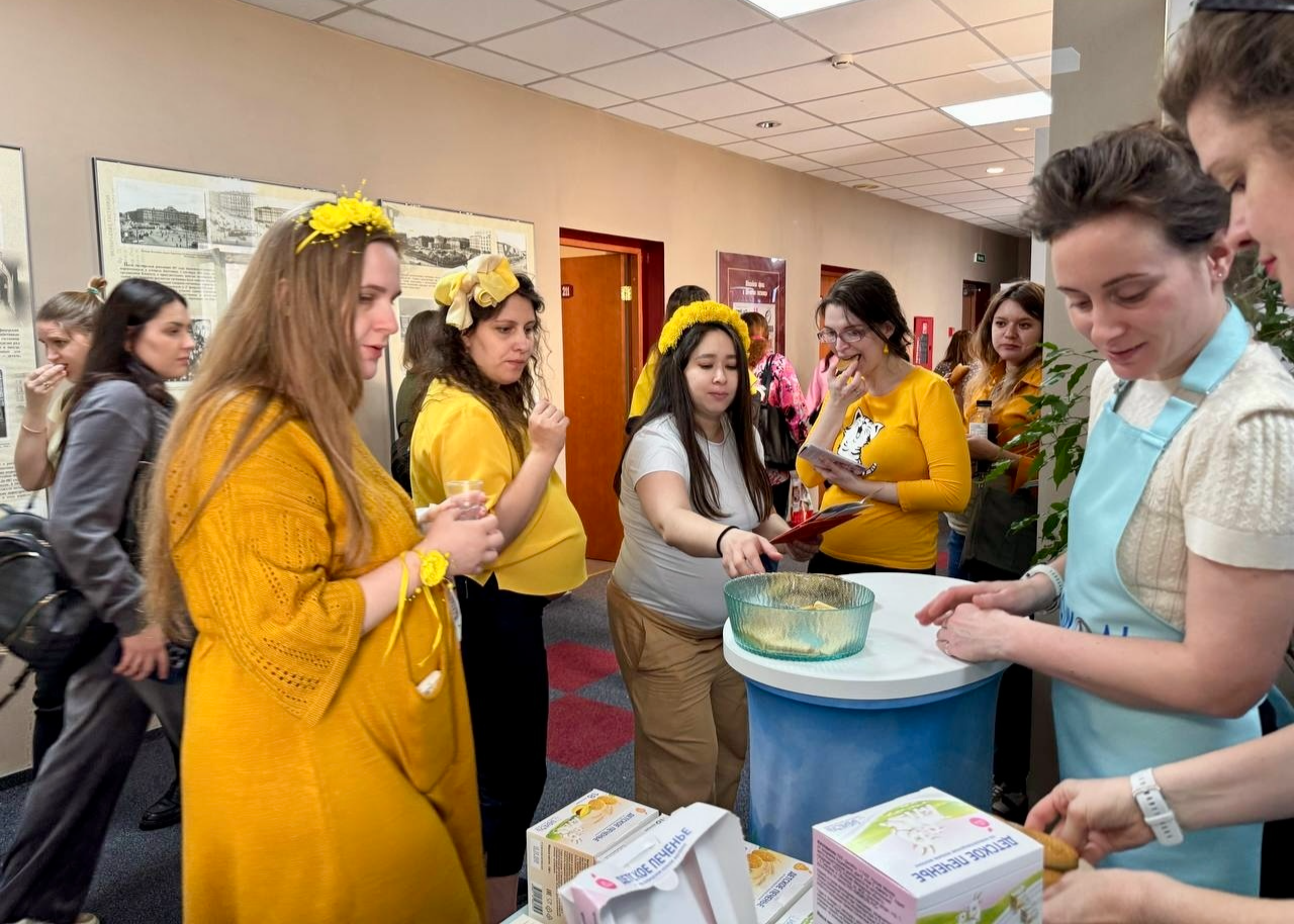 Тема мероприятия — "Желтая вечеринка" для Клуба беременных и "Пижамная вечеринка" для Клуба мам. Большая часть посетительниц откликнулась на заявленный организатором дресс-код. На площадке царило яркое весеннее настроение, а атмосферу праздника поддерживал приглашенный коллектив "Ежкин кот бэнд".
