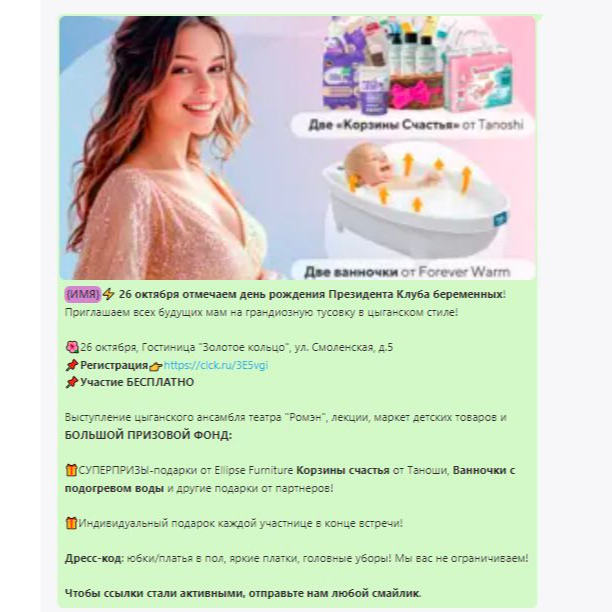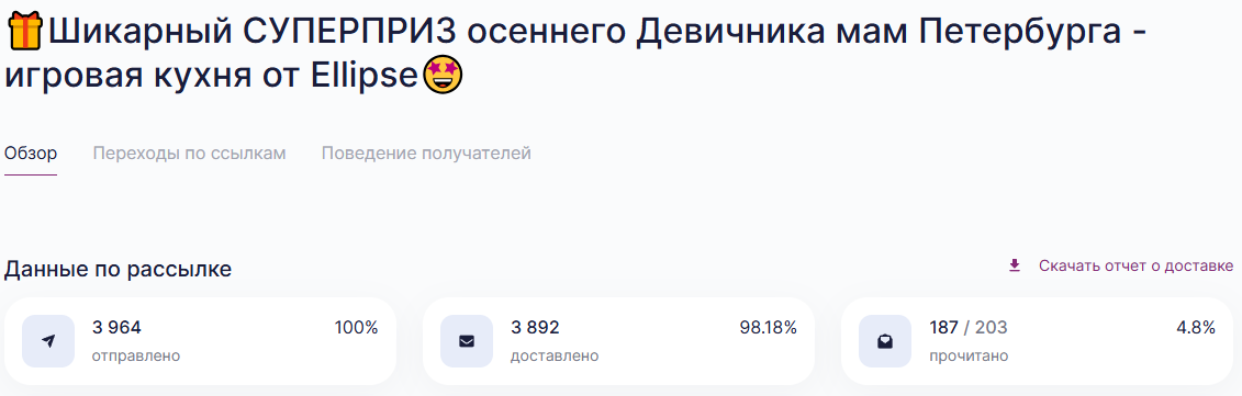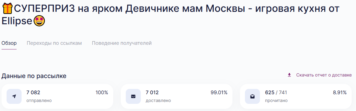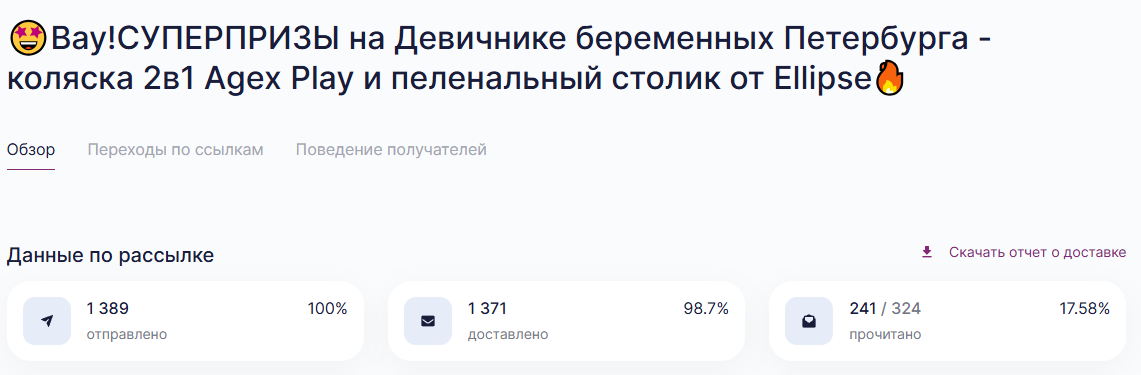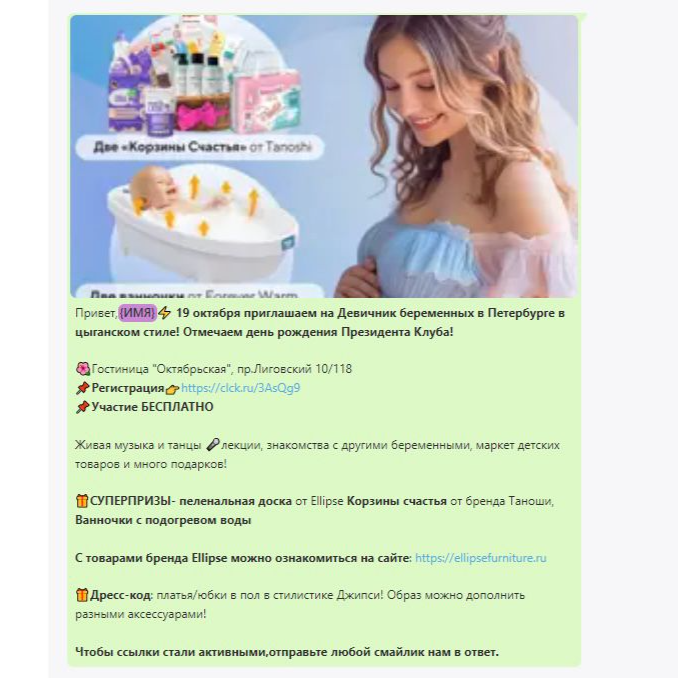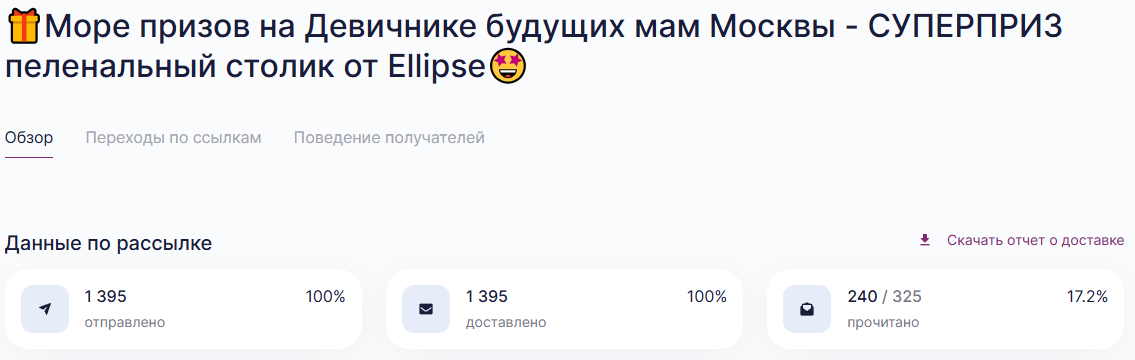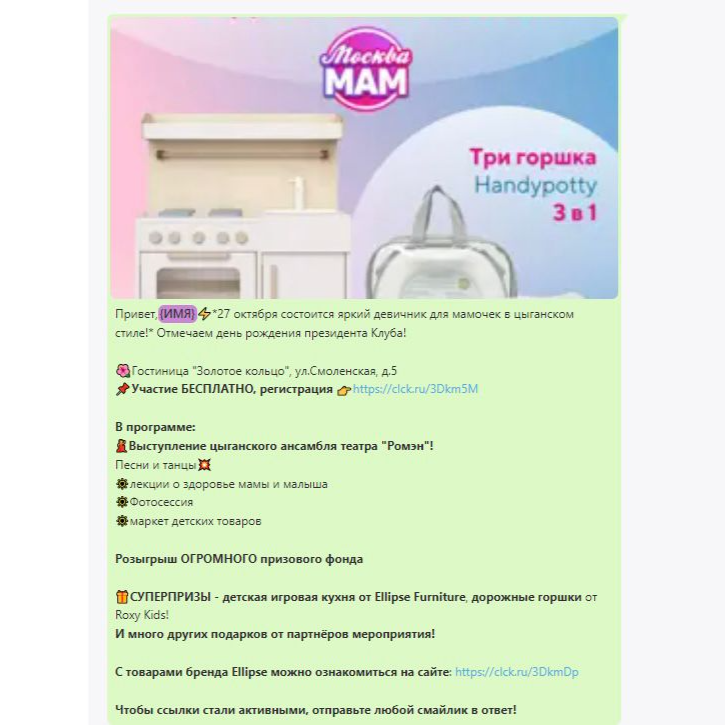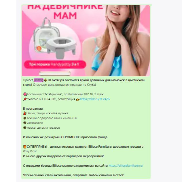 Представляем вашему вниманию отчет о работе, проделанной агентством Club mama в рамках продвижения генерального приза на мероприятиях "Питер, Рожай", "Питер Мам", "Москва, Рожай", "Москва Мам". | | | | Место проведения: Санкт-Петербург, гостиница «Октябрьская» 4* Дата проведения: 19 октября 2024 г. (Питер, Рожай!) 20 октября 2024г. (Питер Мам) Время проведения мероприятия: 19.10.2024 - с 10:00 до 15:00 и с 16:00 до 21:00 (две сессии) 20.10.2024 - с 11:00 до 15:30 Полная посадка в зале в оба дня. | | | | Девичники посетили 603 девушки | | | Место проведения: Москва, гостиница "Золотое кольцо" 5* Дата проведения: 26 октября 2024 г.(Москва, Рожай!), 27 октября 2024г. (Москва Мам) Время проведения мероприятия: 26.10.24 - с 10:00 до 15:00 и с 16:00 до 21:00 (две сессии). 27.10.24 - с 11:00 до 16:00. Полная посадка в зале в оба дня. | | | | Девичники посетили 635 девушек | | | E-mail рассылки с акцентированием на бренде | | | | WhatsApp рассылка с акцентированием на бренде | | | | | WhatsApp рассылка-приглашение участниц с акцентированием на бренде | | | | | Питер, Рожай | 1231 контакт | | | Москва, Рожай | 1500 контактов | | | | | Питер Мам | 2580 контакт | | | Москва Мам | 2100 контактов | | | | Посещаемость сайта за время размещения информации о призах. Указаны уникальные пользователи, которые увидели рекламу призового фонда. | | | | Розыгрыш СУПЕРПРИЗА на мероприятиях в Петербурге | | | | Розыгрыш СУПЕРПРИЗА на мероприятиях в Москве | | | | Рады нашему сотрудничеству! | | | | Календарь активностей 2024 | | | |