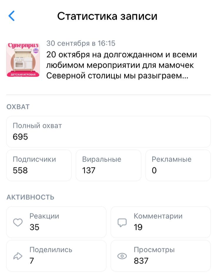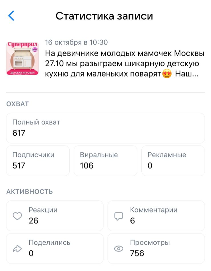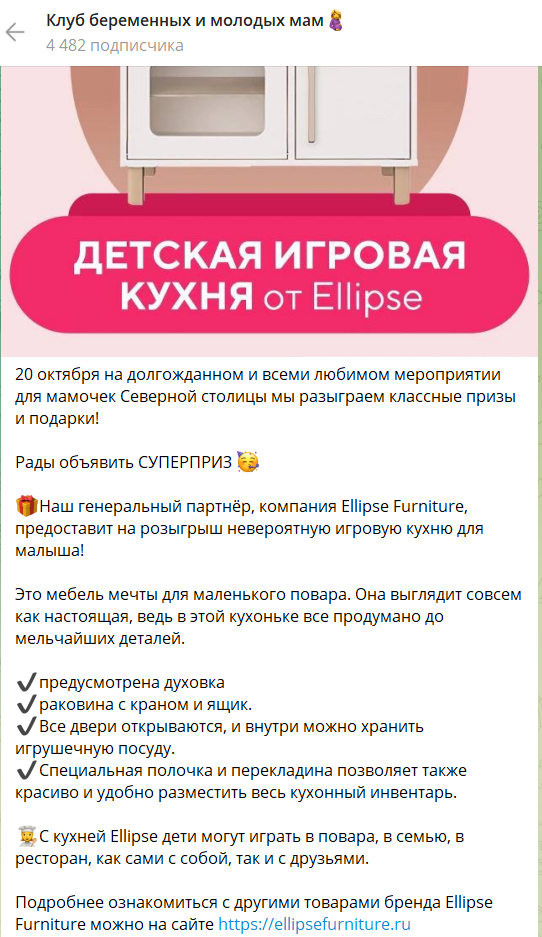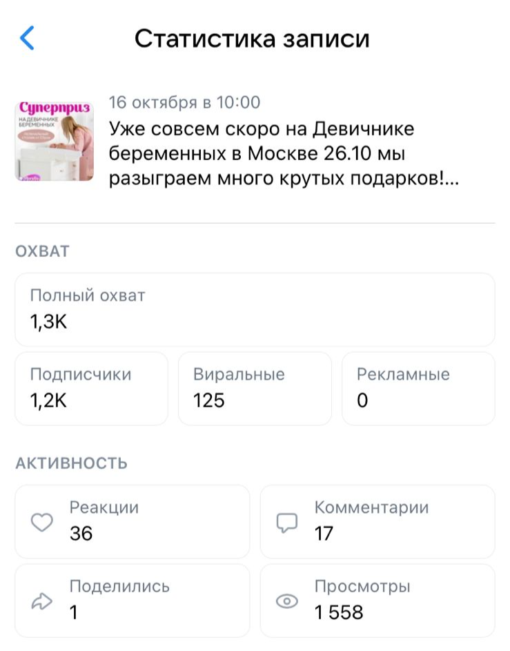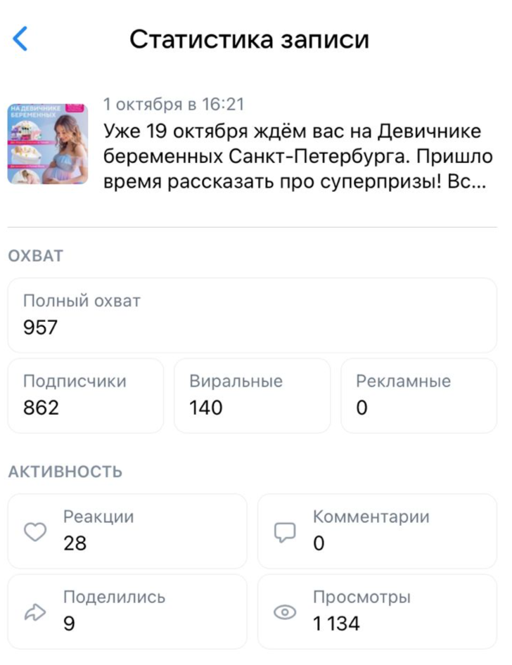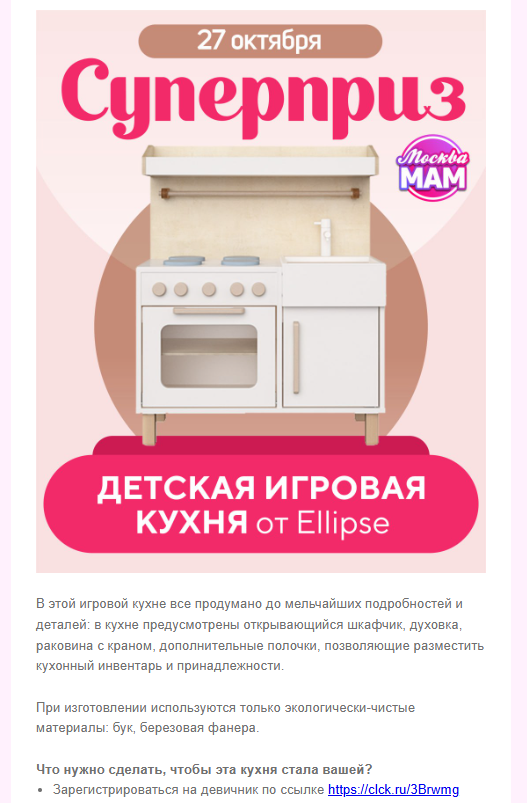 Представляем вашему вниманию отчет о работе, проделанной агентством Club mama в рамках продвижения генерального приза на мероприятиях "Питер, Рожай", "Питер Мам", "Москва, Рожай", "Москва Мам". | | | | Место проведения: Санкт-Петербург, гостиница «Октябрьская» 4* Дата проведения: 19 октября 2024 г. (Питер, Рожай!) 20 октября 2024г. (Питер Мам) Время проведения мероприятия: 19.10.2024 - с 10:00 до 15:00 и с 16:00 до 21:00 (две сессии) 20.10.2024 - с 11:00 до 15:30 Полная посадка в зале в оба дня. | | | | Девичники посетили 603 девушки | | | Место проведения: Москва, гостиница "Золотое кольцо" 5* Дата проведения: 26 октября 2024 г.(Москва, Рожай!), 27 октября 2024г. (Москва Мам) Время проведения мероприятия: 26.10.24 - с 10:00 до 15:00 и с 16:00 до 21:00 (две сессии). 27.10.24 - с 11:00 до 16:00. Полная посадка в зале в оба дня. | | | | Девичники посетили 635 девушек | | | E-mail рассылки с акцентированием на бренде | | | | WhatsApp рассылка с акцентированием на бренде | | | | | WhatsApp рассылка-приглашение участниц с акцентированием на бренде | | | | | Питер, Рожай | 1231 контакт | | | Москва, Рожай | 1500 контактов | | | | | Питер Мам | 2580 контакт | | | Москва Мам | 2100 контактов | | | | Посещаемость сайта за время размещения информации о призах. Указаны уникальные пользователи, которые увидели рекламу призового фонда. | | | | Розыгрыш СУПЕРПРИЗА на мероприятиях в Петербурге | | | | Розыгрыш СУПЕРПРИЗА на мероприятиях в Москве | | | | Рады нашему сотрудничеству! | | | | Календарь активностей 2024 | | | |