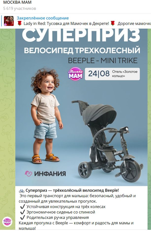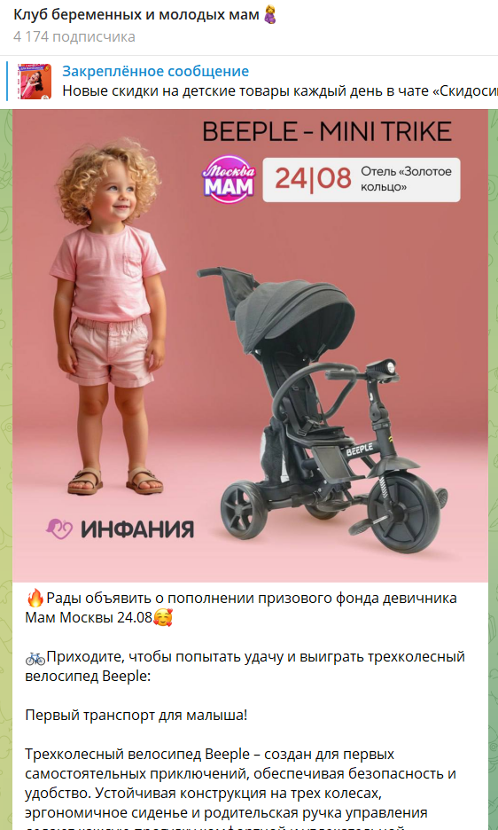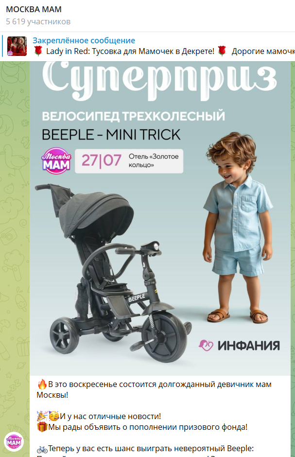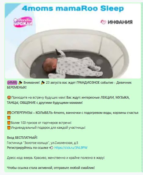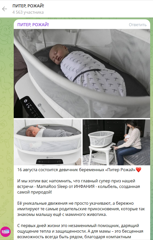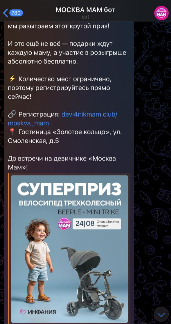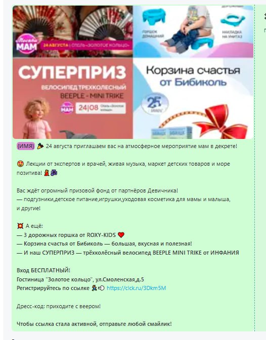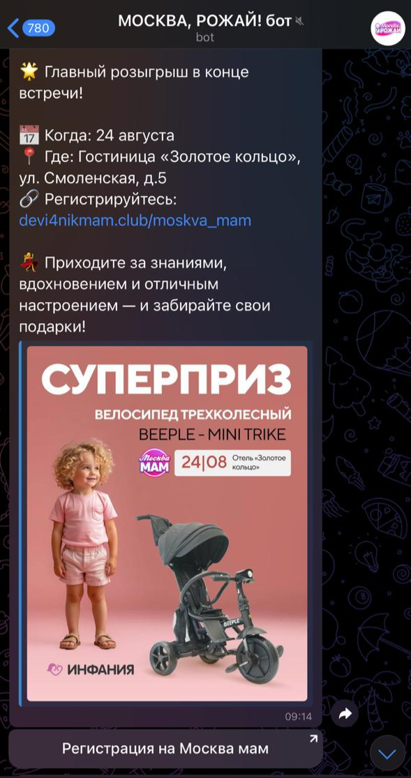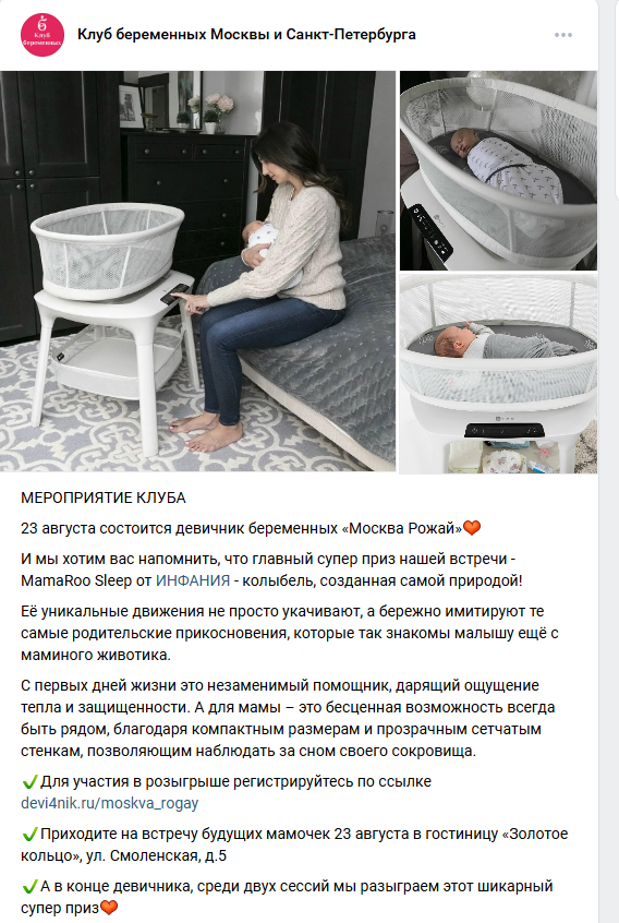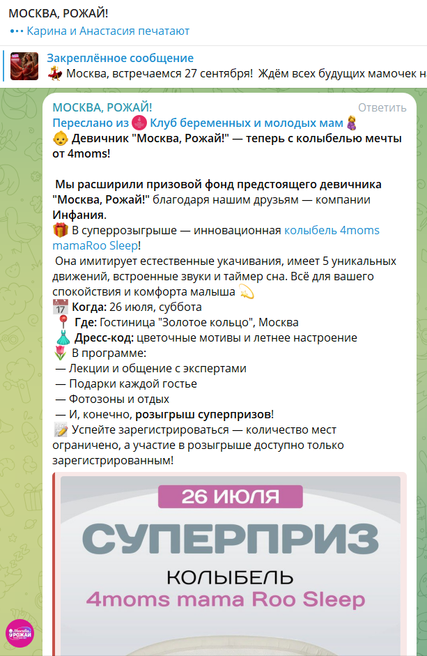 Представляем вашему вниманию отчет о работе, проделанной агентством Club mama в рамках продвижения генерального приза на мероприятиях "Питер, Рожай", "Москва, Рожай", "Москва Мам". | | | | Место проведения: Москва, гостиница "Золотое кольцо" 5* Дата проведения: 26 июля 2025 г.(Москва, Рожай), 27 июля 2025г. (Москва Мам) Время проведения мероприятия: 26.07.25 - с 10:00 до 15:00 и с 16:00 до 21:00 (две сессии). 27.07.25 - с 11:00 до 16:00. Полная посадка в зале в оба дня. | | | | Девичники посетили 644 девушки | | | Розыгрыш СУПЕРПРИЗА на мероприятиях Москва, Рожай и Москва Мам июль 2025г. | | | | Розыгрыш колыбели 4moms mamaRoo Sleep. Во время мероприятия ведущий три раза анонсировал бренд и наименование приза. | | | Розыгрыш велосипеда Beeple mini trike. Во время мероприятия ведущий три раза анонсировал бренд и наименование приза. | | | Место проведения: Санкт-Петербург, гостиница «Октябрьская» 4* Дата проведения: 16 августа 2025г. Время проведения мероприятия: с 10:00 до 15:00 и с 16:00 до 21:00 (две сессии) Полная посадка. | | | | Девичник посетили 473 девушки | | | Розыгрыш СУПЕРПРИЗА на мероприятии Питер, Рожай август 2025г. | | | | Розыгрыш колыбели 4moms mamaRoo Sleep. Во время мероприятия ведущий три раза анонсировал бренд и наименование приза. | | | Девичники посетили 594 девушки | | | Розыгрыш СУПЕРПРИЗА на мероприятиях Москва, Рожай и Москва Мам август 2025г. | | | | Розыгрыш колыбели 4moms mamaRoo Sleep. Во время мероприятия ведущий три раза анонсировал бренд и наименование приза. | | | Розыгрыш велосипеда Beeple mini trike. Во время мероприятия ведущий три раза анонсировал бренд и наименование приза. | | | | Размещение в Телеграм-чатах Клуба беременных и мам | | | | | WhatsApp | WhatsApp рассылка-приглашение участниц с акцентированием на бренде | | | | | Москва, Рожай | 5 300 ежемесячно | | | Москва Мам | 3 600 ежемесячно | | | | Благодарим за сотрудничество! | | | |