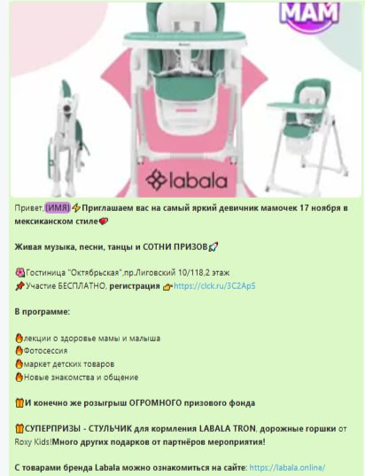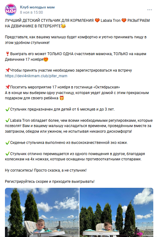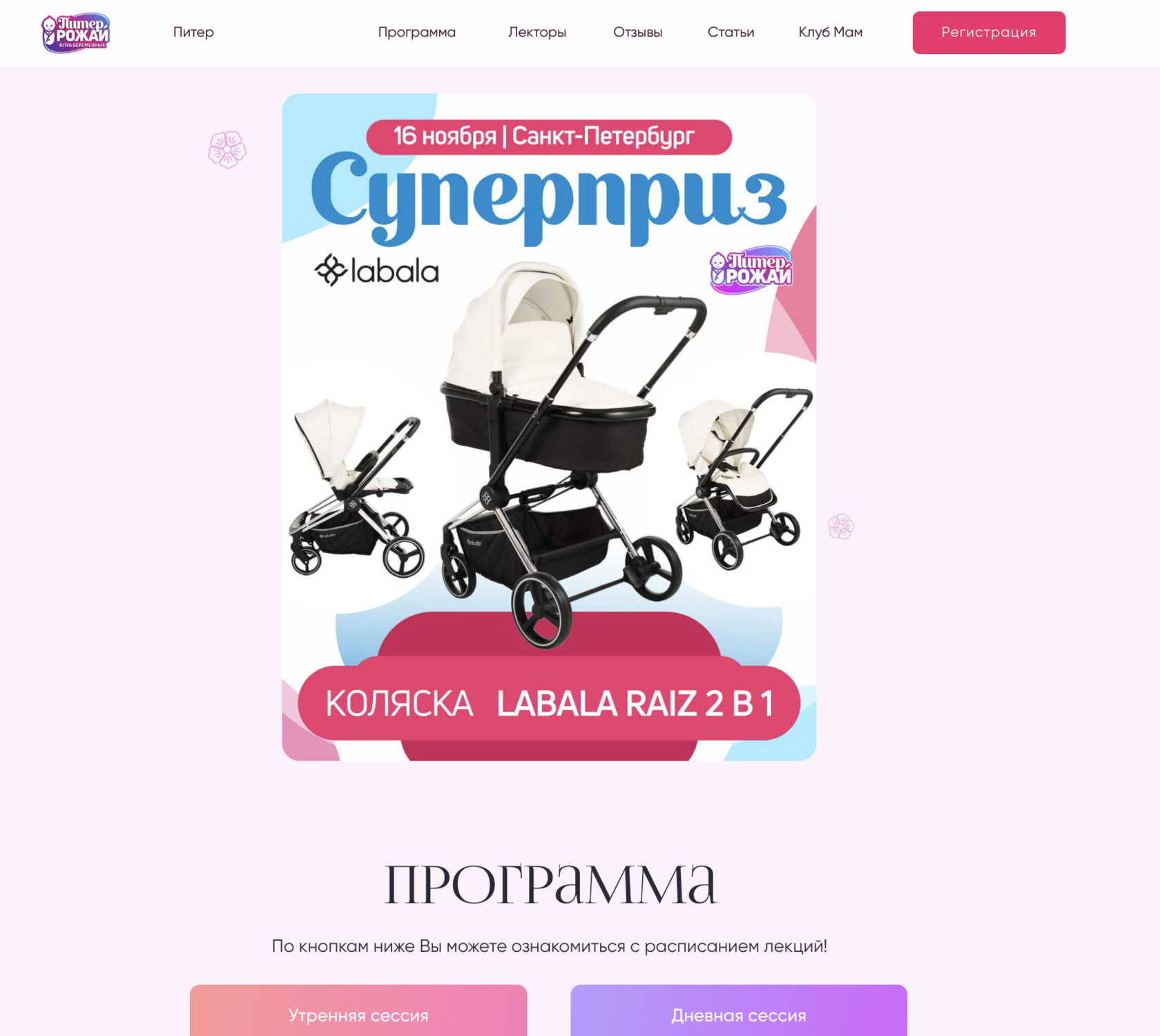 Место проведения: Санкт-Петербург, гостиница «Октябрьская» 4* Дата проведения: 16 ноября 2024 г. (Питер, Рожай!) 17 ноября 2024г. (Питер Мам) Время проведения мероприятия: 16.11.2024 - с 10:00 до 15:00 и с 16:00 до 21:00 (две сессии) 17.11.2024 - с 11:00 до 15:30 Полная посадка в зале в оба дня. |