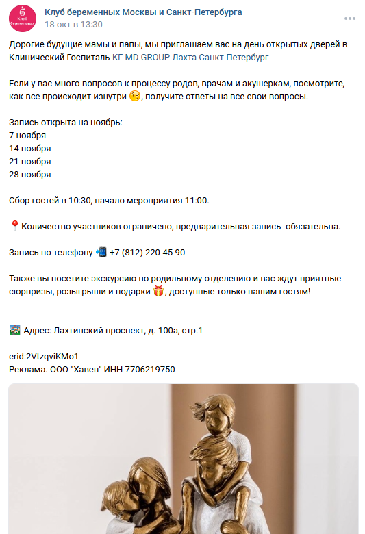 Задача заключалась в том, чтобы не нарушая планового графика дней открытых дверей, самостоятельно сделать сбор дополнительной группы посетителей, при этом не используя никаких коммерческих преференций (скидки на сопровождение и роды, подарки и прочее).