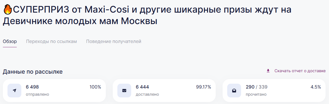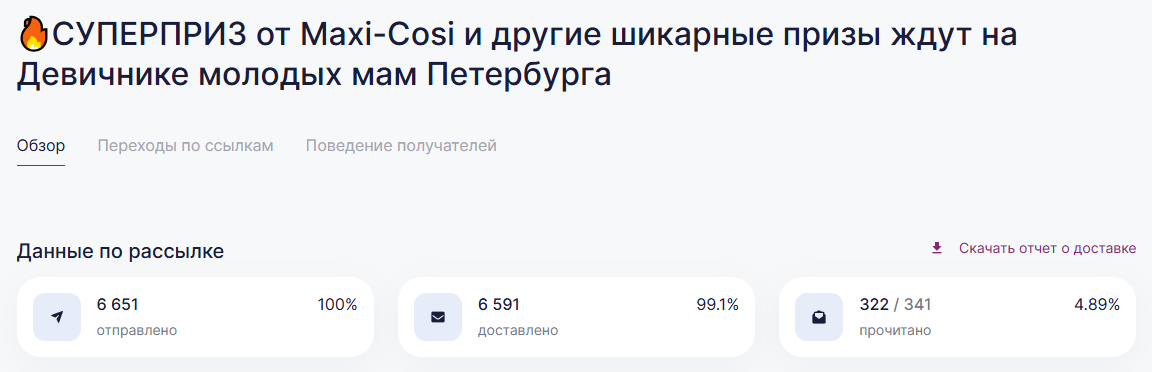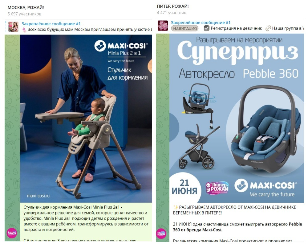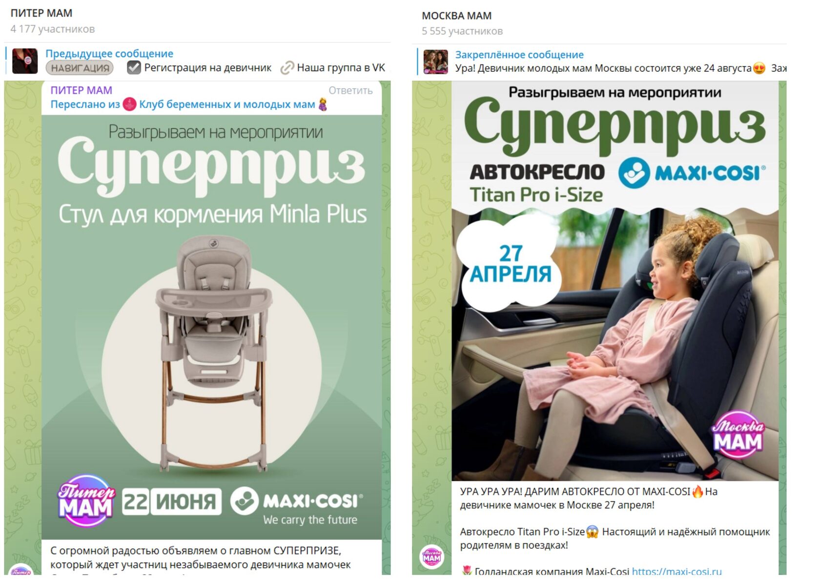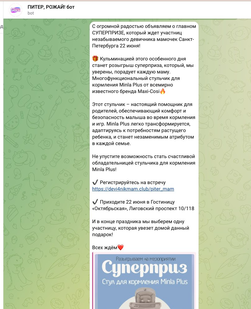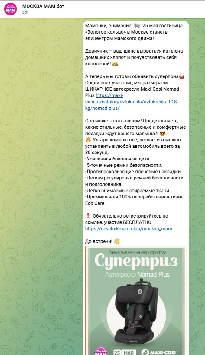 Онлайн и офлайн продвижение продукции и бренда | | | | Итоговый отчёт по продвижению бренда Maxi-Cosi за апрель, май, июнь и июль 2025г. | | | | Общий охват по соц. сетям составляет | Более 135 000 контактов будущих и уже мам | | | | Розыгрыш СУПЕРПРИЗА на мероприятии Питер, Рожай 19 апреля | | | | Розыгрыш автокресла Maxi-Cosi Pebble 360. Во время мероприятия ведущий три раза анонсировал бренд и наименование приза. | | | Розыгрыш СУПЕРПРИЗА на мероприятии Питер Мам 20 апреля | | | | Розыгрыш шезлонга Maxi-Cosi Kori. Во время мероприятия ведущий три раза анонсировал бренд и наименование приза. | | | Розыгрыш СУПЕРПРИЗА на мероприятии Москва, Рожай 26 апреля | | | | Розыгрыш автокресла Maxi-Cosi Mica 360 S. Во время мероприятия ведущий три раза анонсировал бренд и наименование приза. | | | Розыгрыш СУПЕРПРИЗА на мероприятии Москва Мам 27 апреля | | | | Розыгрыш автокресла Maxi-Cosi Titan Pro i-Size. Во время мероприятия ведущий три раза анонсировал бренд и наименование приза. | | | Розыгрыш СУПЕРПРИЗА на мероприятии Питер, Рожай 17 мая | | | | Розыгрыш прогулочной коляски Maxi-Cosi Leona. Во время мероприятия ведущий три раза анонсировал бренд и наименование приза. | | | Розыгрыш СУПЕРПРИЗА на мероприятии Москва, Рожай 24 мая | | | | Розыгрыш автокресла Maxi-Cosi Coral 360. Во время мероприятия ведущий три раза анонсировал бренд и наименование приза. | | | Розыгрыш СУПЕРПРИЗА на мероприятии Москва Мам 25 мая | | | | Розыгрыш автокресла Maxi-Cosi Nomad Plus. Во время мероприятия ведущий три раза анонсировал бренд и наименование приза. | | | Розыгрыш СУПЕРПРИЗА на мероприятии Питер, Рожай 21 июня | | | | Розыгрыш автокресла Maxi-Cosi Pebble 360. Во время мероприятия ведущий три раза анонсировал бренд и наименование приза. | | | Розыгрыш СУПЕРПРИЗА на мероприятии Питер Мам 22 июня | | | | Розыгрыш стульчика для кормления Maxi-Cosi Minla Plus. Во время мероприятия ведущий три раза анонсировал бренд и наименование приза. | | | Розыгрыш СУПЕРПРИЗА на мероприятии Москва, Рожай 28 июня | | | | Розыгрыш автокресла Maxi-Cosi CabrioFix i-Size. Во время мероприятия ведущий три раза анонсировал бренд и наименование приза. | | | Розыгрыш СУПЕРПРИЗА на мероприятии Москва Мам 29 июня | | | | Розыгрыш автокресла Maxi-Cosi RodiFix S i-Size. Во время мероприятия ведущий три раза анонсировал бренд и наименование приза. | | | | E-mail рассылки моделей по базе | Более 50 000 контактов | | | | | E-mail напоминания о мероприятии с вашим брендом и призом | E-mail рассылки-напоминания о встрече с акцентированием на бренде в количестве 4 шт, суммарно на 3 000 зарегистрированных москвичек и петербурженок ежемесячно. | | | | Статистика е-mail рассылок | | | | WhatsApp | WhatsApp рассылка-приглашение участниц с акцентированием на бренде | | | | | Размещение в Телеграм-чатах Клуба беременных и мам | | | | Статистика рассылок в Телеграм | | | | Питер, Рожай | 4 000 ежемесячно | | | Питер Мам | 4 000 ежемесячно | | | | | Москва, Рожай | 5 300 ежемесячно | | | Москва Мам | 3 600 ежемесячно | | | | Размещение на сайте карточки бренда | | | | Призовой фонд на сайте | Макет приза и бренда | | | | | Приведены цифры посещаемости сайтов девичника мам и девичника беременных | | | | | Сайт https://devi4nikmam.club/ | Статистика с 1 апреля по 29 июня 2025г. | | | | | Сайт https://devi4nik.ru/ | Статистика с 1 апреля по 29 июня 2025г. | | | | Благодарим за сотрудничество! | | | |