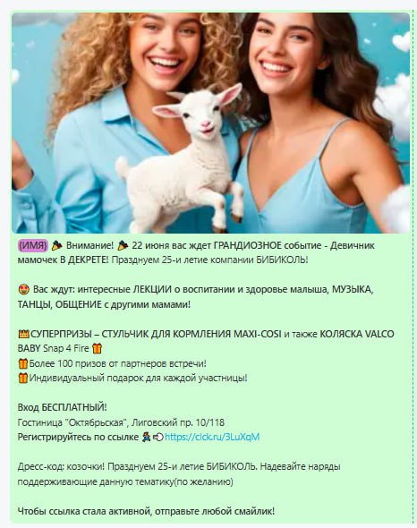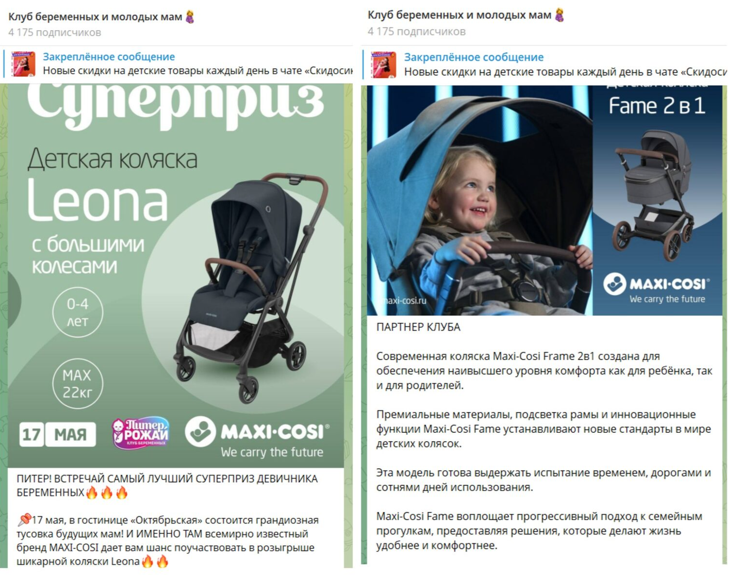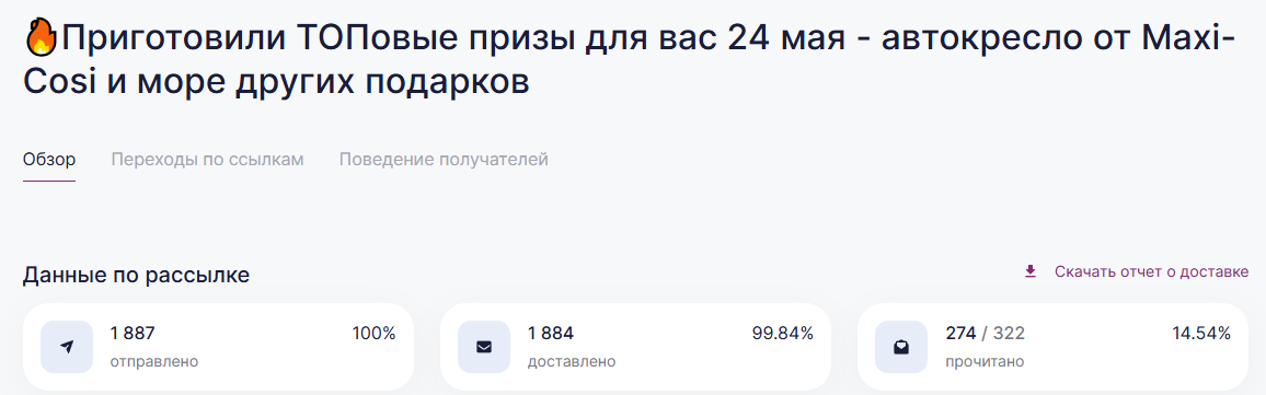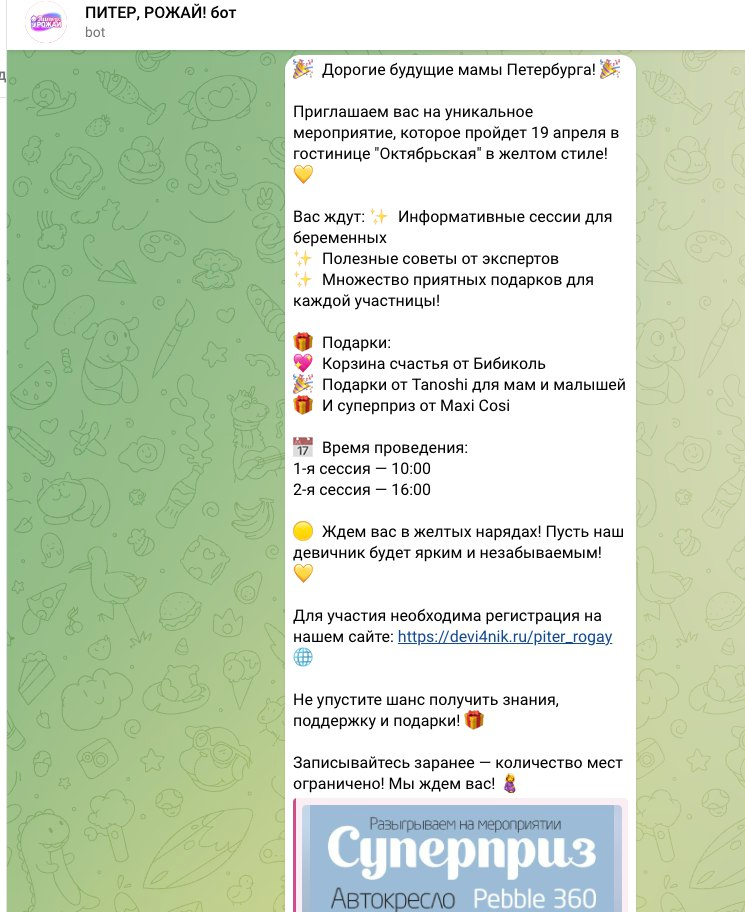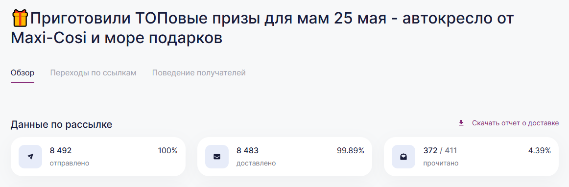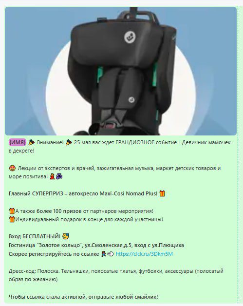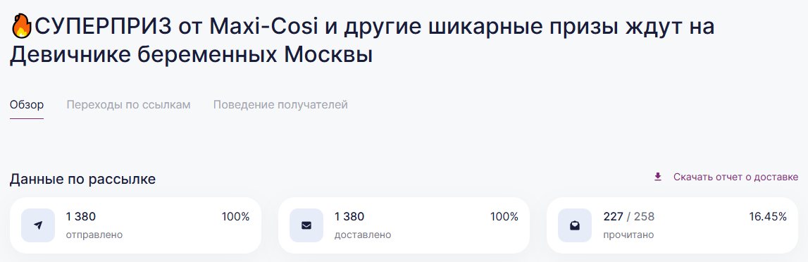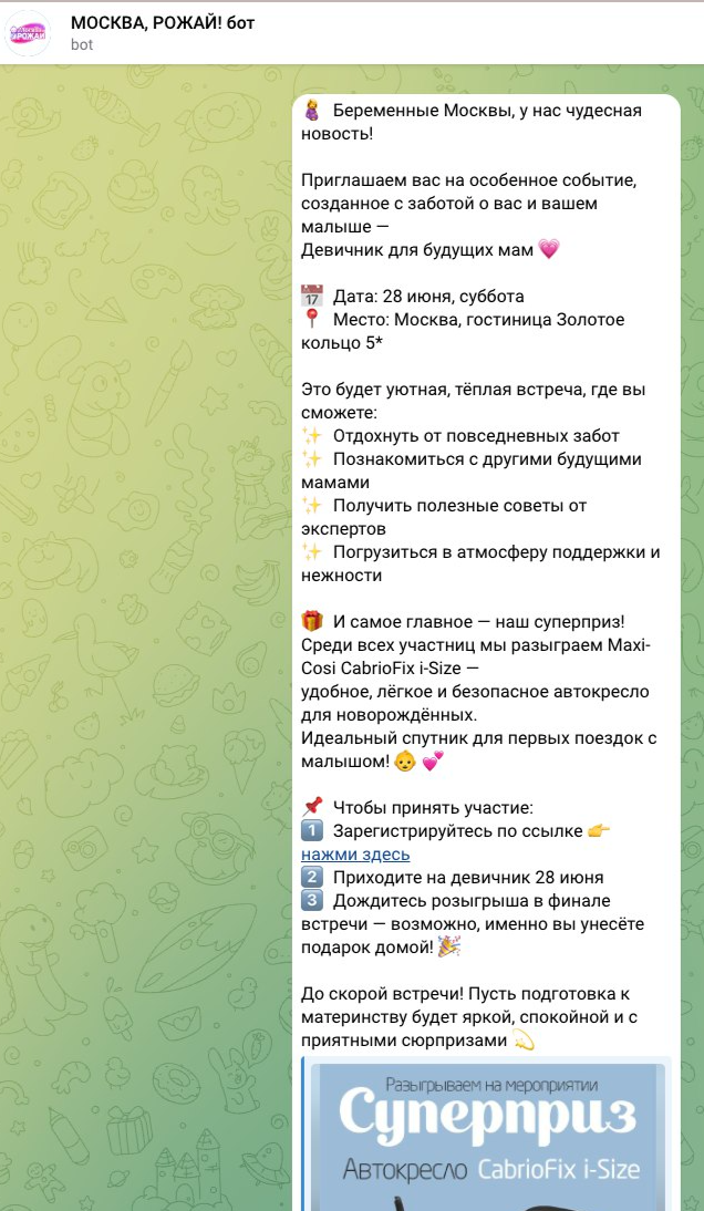 Онлайн и офлайн продвижение продукции и бренда | | | | Итоговый отчёт по продвижению бренда Maxi-Cosi за апрель, май, июнь и июль 2025г. | | | | Общий охват по соц. сетям составляет | Более 135 000 контактов будущих и уже мам | | | | Розыгрыш СУПЕРПРИЗА на мероприятии Питер, Рожай 19 апреля | | | | Розыгрыш автокресла Maxi-Cosi Pebble 360. Во время мероприятия ведущий три раза анонсировал бренд и наименование приза. | | | Розыгрыш СУПЕРПРИЗА на мероприятии Питер Мам 20 апреля | | | | Розыгрыш шезлонга Maxi-Cosi Kori. Во время мероприятия ведущий три раза анонсировал бренд и наименование приза. | | | Розыгрыш СУПЕРПРИЗА на мероприятии Москва, Рожай 26 апреля | | | | Розыгрыш автокресла Maxi-Cosi Mica 360 S. Во время мероприятия ведущий три раза анонсировал бренд и наименование приза. | | | Розыгрыш СУПЕРПРИЗА на мероприятии Москва Мам 27 апреля | | | | Розыгрыш автокресла Maxi-Cosi Titan Pro i-Size. Во время мероприятия ведущий три раза анонсировал бренд и наименование приза. | | | Розыгрыш СУПЕРПРИЗА на мероприятии Питер, Рожай 17 мая | | | | Розыгрыш прогулочной коляски Maxi-Cosi Leona. Во время мероприятия ведущий три раза анонсировал бренд и наименование приза. | | | Розыгрыш СУПЕРПРИЗА на мероприятии Москва, Рожай 24 мая | | | | Розыгрыш автокресла Maxi-Cosi Coral 360. Во время мероприятия ведущий три раза анонсировал бренд и наименование приза. | | | Розыгрыш СУПЕРПРИЗА на мероприятии Москва Мам 25 мая | | | | Розыгрыш автокресла Maxi-Cosi Nomad Plus. Во время мероприятия ведущий три раза анонсировал бренд и наименование приза. | | | Розыгрыш СУПЕРПРИЗА на мероприятии Питер, Рожай 21 июня | | | | Розыгрыш автокресла Maxi-Cosi Pebble 360. Во время мероприятия ведущий три раза анонсировал бренд и наименование приза. | | | Розыгрыш СУПЕРПРИЗА на мероприятии Питер Мам 22 июня | | | | Розыгрыш стульчика для кормления Maxi-Cosi Minla Plus. Во время мероприятия ведущий три раза анонсировал бренд и наименование приза. | | | Розыгрыш СУПЕРПРИЗА на мероприятии Москва, Рожай 28 июня | | | | Розыгрыш автокресла Maxi-Cosi CabrioFix i-Size. Во время мероприятия ведущий три раза анонсировал бренд и наименование приза. | | | Розыгрыш СУПЕРПРИЗА на мероприятии Москва Мам 29 июня | | | | Розыгрыш автокресла Maxi-Cosi RodiFix S i-Size. Во время мероприятия ведущий три раза анонсировал бренд и наименование приза. | | | | E-mail рассылки моделей по базе | Более 50 000 контактов | | | | | E-mail напоминания о мероприятии с вашим брендом и призом | E-mail рассылки-напоминания о встрече с акцентированием на бренде в количестве 4 шт, суммарно на 3 000 зарегистрированных москвичек и петербурженок ежемесячно. | | | | Статистика е-mail рассылок | | | | WhatsApp | WhatsApp рассылка-приглашение участниц с акцентированием на бренде | | | | | Размещение в Телеграм-чатах Клуба беременных и мам | | | | Статистика рассылок в Телеграм | | | | Питер, Рожай | 4 000 ежемесячно | | | Питер Мам | 4 000 ежемесячно | | | | | Москва, Рожай | 5 300 ежемесячно | | | Москва Мам | 3 600 ежемесячно | | | | Размещение на сайте карточки бренда | | | | Призовой фонд на сайте | Макет приза и бренда | | | | | Приведены цифры посещаемости сайтов девичника мам и девичника беременных | | | | | Сайт https://devi4nikmam.club/ | Статистика с 1 апреля по 29 июня 2025г. | | | | | Сайт https://devi4nik.ru/ | Статистика с 1 апреля по 29 июня 2025г. | | | | Благодарим за сотрудничество! | | | |