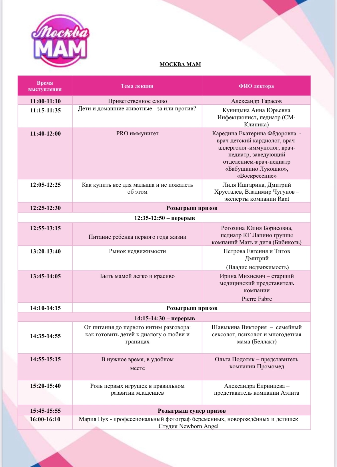 27 и 28 сентября в пятизвёздочном отеле «Золотое кольцо» в центре Москвы состоялись встречи «Москва, Рожай» и «Москва Мам». | | | Девичники посетили 628 девушек | | | Мини-выставка товаров и услуг | В мероприятии принимали участие 17 крупных федеральных компаний России. Во время всего мероприятия работала выставочная зона, на которой можно было посмотреть и протестировать товары для мам и малышей и подробнее узнать о представляемых услугах. Партнеры мероприятия предоставили свою продукцию на стендах. | | | | Фотозона | На фоне пресс-вола гости делали памятные фото | | | | Костюмированное шоу участниц | Наши яркие участницы с большим воодушевлением поддержали тематику «Вечеринка в красном». На площадке царила яркая атмосфера благодаря креативности и фантазии прекрасных мам! | | | | Подарочный пакет участницы | Все посетительницы мероприятия получали пакет участницы в конце лектория с продукцией от партнера | | | | Общий призовой фонд мероприятия | На праздничных девичниках был разыгран крупнейший призовой фонд, предоставленный многочисленными партнёрами Клуба беременных и молодых мам. Столы ломятся от подарков: очевидно, что с пустыми руками с мероприятия не уйдёт ни одна мама. | | | | | Подарочный стол Клуба беременных | | | | | Подарочный стол Клуба молодых мам | | | | Рады нашему сотрудничеству! | | | | Подписывайтесь на новости компании в телеграм канале | | | | Увидеть все наши проекты можно на сайте | | | Календарь активностей 2025 | | | На все вопросы готовы ответить наши представители: | | | |