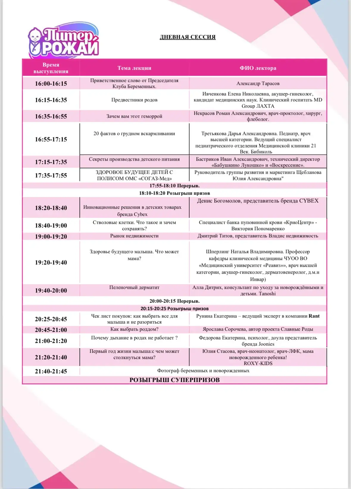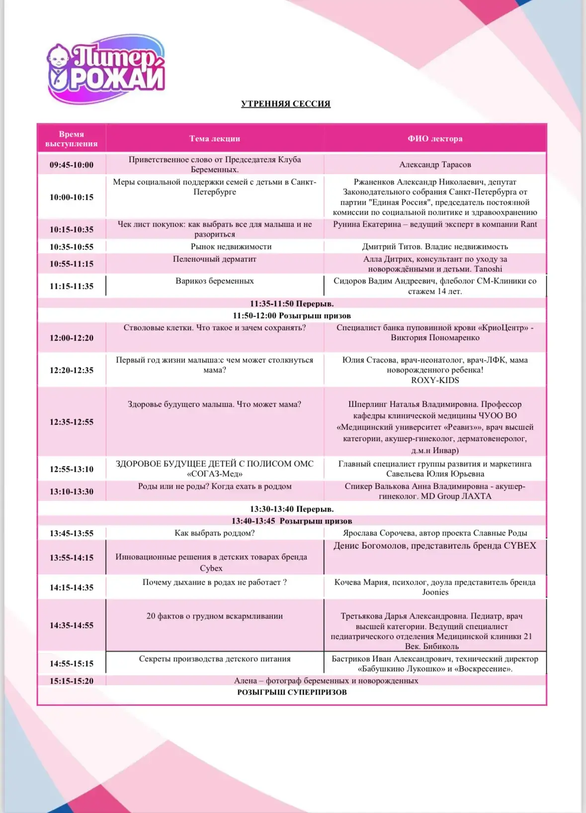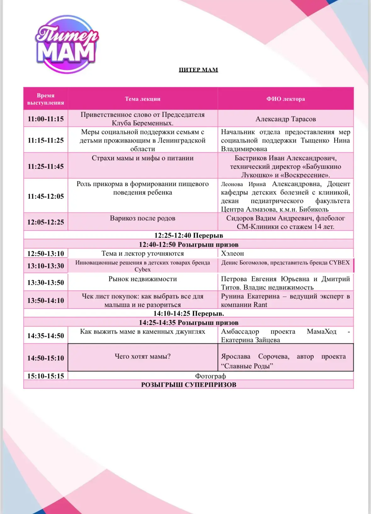 | 18 и 19 апреля в гостинице «Октябрьская» в центре Санкт-Петербурга состоялись встречи «Питер, Рожай» и «Питер мам». | | | | Девичники посетили 620 девушек | | | | Аудитория исключительно женщины. | | | | | | На прошедших выходных в Санкт-Петербурге мы собрали два полных зала будущих и молодых мам. Весна вступила в свои права, и мы в честь самого цветущего времени года посвятили наше мероприятие солнцу! | | | | | | Мини-выставка товаров и услуг | | В мероприятиях принимали участие 19 крупных федеральных компаний России. Во время всего мероприятия работала выставочная зона, на которой можно было посмотреть и протестировать товары для самых маленьких и подробнее узнать о представляемых услугах. Партнеры мероприятия предоставили свою продукцию на стендах мероприятия. | | | | | | Поддержка власти | | В этот раз встречу молодых мам посетили представители администрации Ленинградской области. Открыла мероприятие начальник отдела предоставления мер социальной поддержки Нина Владимировна Тыщенко. | | | | | | Фотозона | | На фоне пресс-вола гости делали памятные фото | | | | | | Костюмированное шоу участниц | | Наши прекрасные участницы с большим воодушевлением участвовали в тематической вечеринке "Солнечная весна!" - все в желтом! | | | | | | Подарочный пакет участницы | | Все посетительницы мероприятия получали пакет участницы в конце лектория с продукцией от партнеров. | | | | | | Общий призовой фонд мероприятия | | На праздничных девичниках был разыгран крупнейший призовой фонд, предоставленный многочисленными партнёрами Клуба беременных и молодых мам. Без индивидуального подарка встречу не покинула ни одна участница. | | | | | | | Подарочный стол Клуба беременных | | | | | | Подарочный стол Клуба молодых мам | | | | Рады нашему сотрудничеству! | | | | | | | Увидеть все наши проекты можно на сайте | | | | | | Отчёты обо всех проектах нашего агентства на нашей платформе в Дзен | | | | | | Все новости о нашей компании и аналитические материалы о рынке детского ритейла | | | | | Календарь активностей 2026 | | | На все вопросы готовы ответить наши представители: | | | |