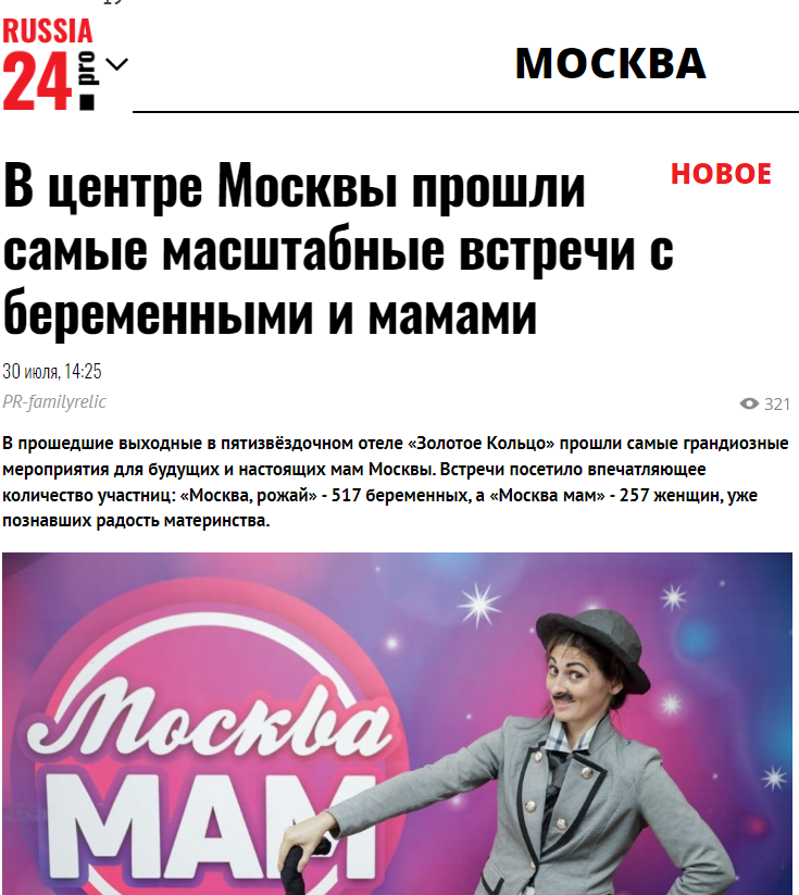 27 и 28 июля в пятизвёздочном отеле «Золотое кольцо» в центре Москвы состоялись ежемесячные встречи «Москва, рожай!» и «Москва мам». | | | Девичники посетили 774 девушки | | | Июль — середина года. А значит пришло время подводить итоги первого полугодия. Наш итог — мы абсолютные рекордсмены по всем показателям, дальше — больше! Будьте с нами, будьте с лидерами! | | | | Мини-выставка товаров и услуг | Во время всего мероприятия работала выставочная зона, на которой можно было посмотреть и протестировать товары для мам и малышей и подробнее узнать о представляемых услугах. Партнеры мероприятия предоставили свою продукцию на стендах мероприятия. | | | | Фотозона | На фоне пресс-вола гости делали памятные фото | | | | Костюмированное шоу участниц | На этот раз мы провели встречи, посвящённые головным уборам. Посмотрите, как наши участницы подготовились к мероприятию. У нас состоялся настоящий парад шляпок! | | | | | Именно благодаря нашему дресс-коду у будущих и молодых мам Москвы появилась возможность раскрыть свою индивидуальность. | | | | Музыкальная программа | Праздничным настроением всех участниц заряжал приглашенный диджей | | | | Подарочный пакет участницы | Все посетительницы мероприятия получали пакет участницы в конце лектория с продукцией от партнера | | | | Общий призовой фонд мероприятия | На праздничных девичниках был разыгран крупнейший призовой фонд, предоставленный многочисленными партнёрами Клуба беременных и молодых мам. Без индивидуального подарка встречу не покинула ни одна участница. | | | | Работа со СМИ – одно из важнейших направлений нашей деятельности. Каждое наше мероприятие освещается профильными изданиями. | | | | Рады нашему сотрудничеству! | | | Подписывайтесь на новости компании в телеграм канале | | | Увидеть все наши проекты можно на сайте | | | Календарь активностей 2024 | | | Как проходят наши другие мероприятия вы можете посмотреть на нашем канале в Яндекс Дзен | | | На все вопросы готовы ответить наши представители: | | | |