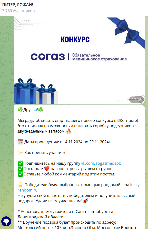 1️⃣ Компания СОГАЗ-Мед приняла участие в Девичниках "Питер, Рожай" (март, май, август, октябрь 2024г. ) в лекционном формате с мини-выставкой продукции. Общий очный охват на мероприятиях в Санкт-Петербурге составил 1737 беременных. 2️⃣ Компания СОГАЗ-Мед приняла участие в Девичниках "Питер, Рожай" (апрель, июнь, сентябрь, ноябрь 2024г.) в заочном формате. Общий заочный охват на мероприятиях в Санкт-Петербурге составил 1571 беременная. Компания примет участие в мероприятии "Питер, Рожай" 14 декабря 2024г. в лекционном формате с мини-выставкой продукции. |