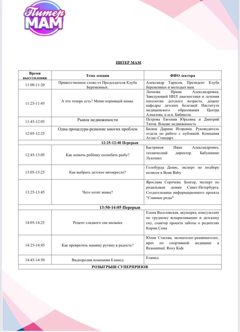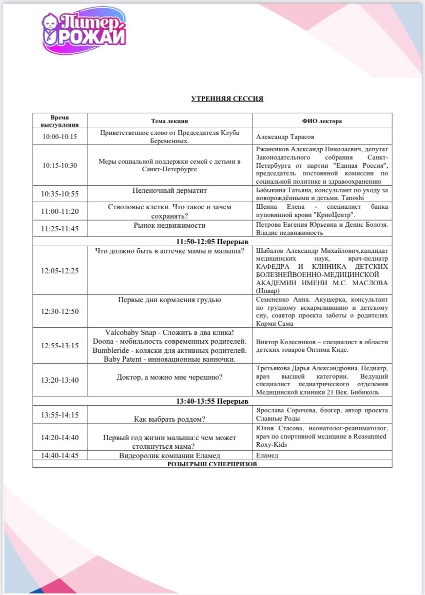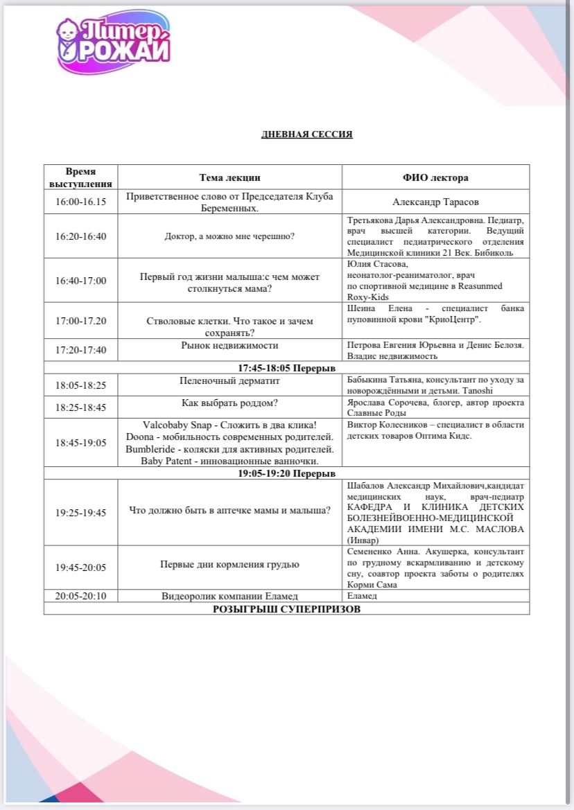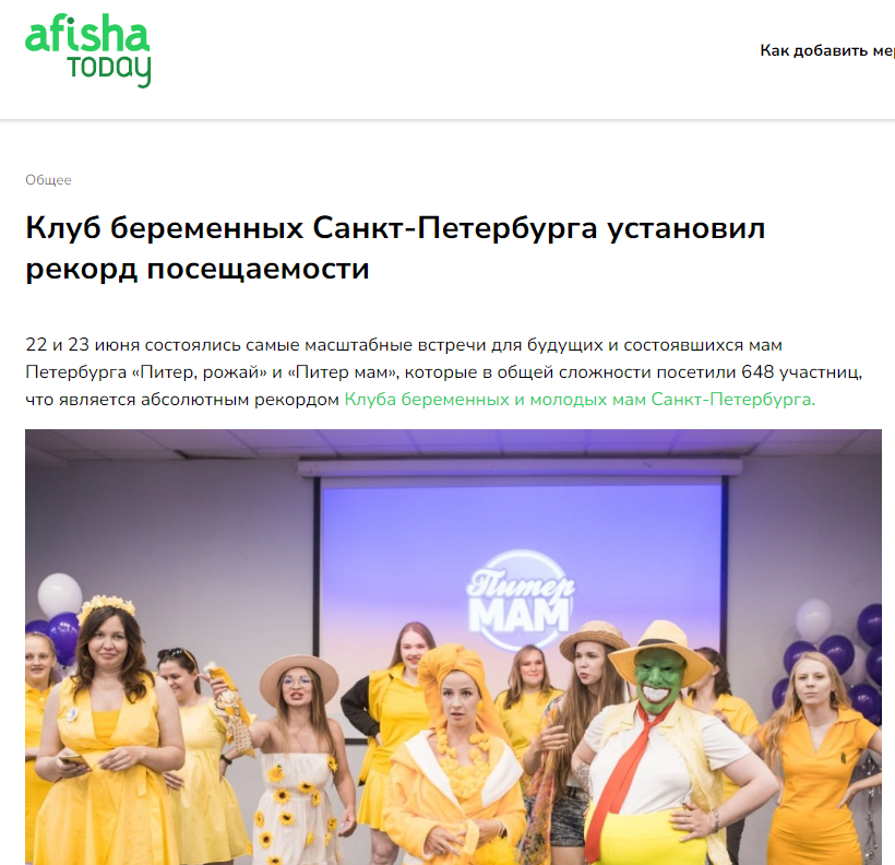 22 и 23 июня в гостинице «Октябрьская» в центре Санкт-Петербурга состоялись ежемесячные встречи «Питер, рожай!» и «Питер мам». | | | Девичники посетили 648 девушек | | | Клуб беременных — неоспоримый и безоговорочный лидер по работе с будущими мамами в городе Санкт Петербурге! | | | | Мини-выставка товаров и услуг | Во время всего мероприятия работала выставочная зона, на которой можно было посмотреть и протестировать товары для самых маленьких и подробнее узнать о представляемых услугах. Партнеры мероприятия предоставили свою продукцию на стендах мероприятия. | | | | Поддержка власти | С напутственным словом на мероприятии выступил председатель постоянной комиссии по здравоохранению и социальной политике законодательного собрания Санкт-Петербурга Александр Николаевич Ржаненков. Он рассказал о мерах поддержки молодых семей, которые предоставляют городские власти. | | | | Фотозона | На фоне пресс-вола гости делали памятные фото | | | | Костюмированное шоу участниц | Наши невероятно красивые участницы откликнулись на объявленный дресс-код и окрасили зал в желтый цвет своими креативными нарядами. | | | | | Будущие и молодые мамы пришли, чтобы окунуться в солнечную атмосферу. | | | | Шоу программа | Благодаря приглашенным артистам в зале царила зажигательная летняя атмосфера и у всех участниц сохранялось ощущение праздника! | | | | Подарочный пакет участницы | Все посетительницы мероприятия получали пакет участницы в конце лектория с продукцией от партнера | | | | Общий призовой фонд мероприятия | На праздничных девичниках был разыгран крупнейший призовой фонд, предоставленный многочисленными партнёрами Клуба беременных и молодых мам. Без индивидуального подарка встречу не покинула ни одна участница. | | | | Работа со СМИ – одно из важнейших направлений нашей деятельности. Каждое наше мероприятие освещается профильными изданиями. | | | | Рады нашему сотрудничеству! | | | Подписывайтесь на новости компании в телеграм канале | | | Увидеть все наши проекты можно на сайте | | | Календарь активностей 2024 | | | Как проходят наши другие мероприятия вы можете посмотреть на нашем канале в Яндекс Дзен | | | На все вопросы готовы ответить наши представители: | | | |