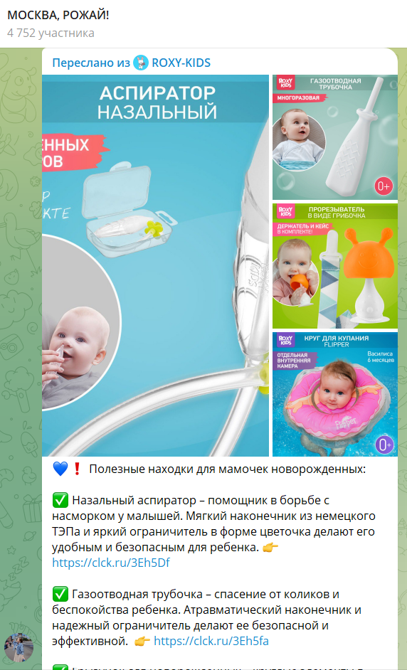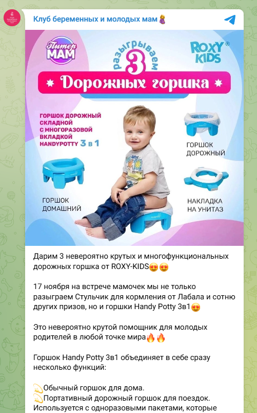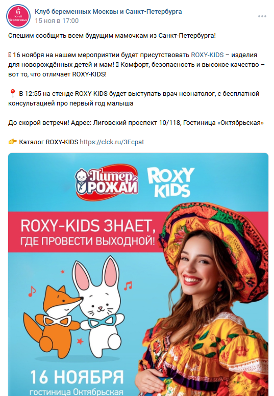 1️⃣ Компания Roxy Kids приняла участие в Девичниках "Питер, Рожай" в лекционном формате с выставкой продукции. Общий охват на мероприятиях в Санкт-Петербурге составил 4066 беременных. В рамках договора компания примет участие в мероприятии "Питер, Рожай" в декабре 2024г. |