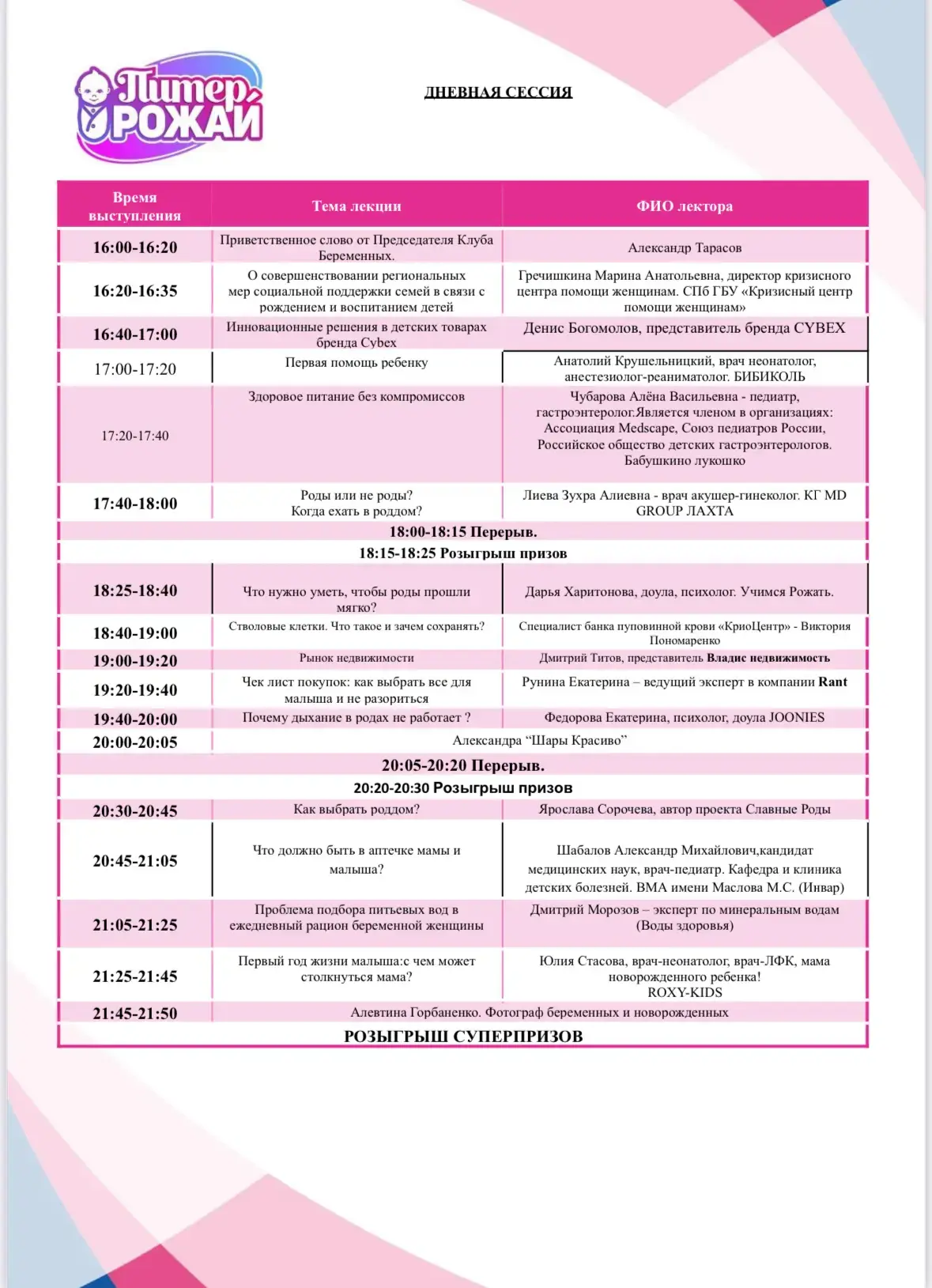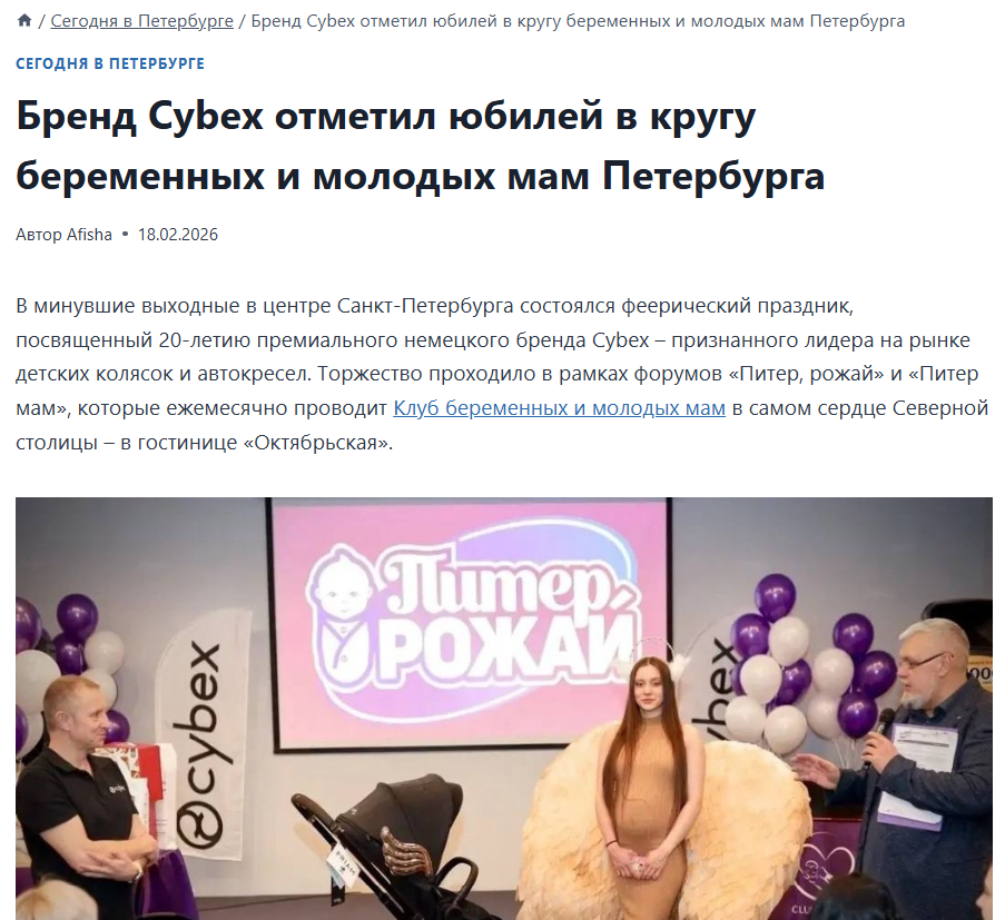 | 14 и 15 февраля в гостинице «Октябрьская» в центре Санкт-Петербурга состоялись встречи «Питер, Рожай» и «Питер мам». | | | | Девичники посетили 549 девушек | | | | Аудитория исключительно женщины. | | | | | | На прошедших выходных мы отмечали 20-летие деятельности в России премиального немецкого бренда по производству автокресел и детских колясок Cybex. Это было ярко, масштабно и, как всегда, грандиозно! | | | | | | Работа со СМИ – одно из важнейших направлений нашей деятельности. Каждое наше мероприятие освещается профильными изданиями. | | | | | | Мини-выставка товаров и услуг | | В мероприятиях принимали участие 18 крупных федеральных компаний России. Во время всего мероприятия работала выставочная зона, на которой можно было посмотреть и протестировать товары для самых маленьких и подробнее узнать о представляемых услугах. Партнеры мероприятия предоставили свою продукцию на стендах мероприятия. | | | | | | Поддержка власти | | С напутственным словом на мероприятии выступил председатель постоянной комиссии по здравоохранению и социальной политике законодательного собрания Санкт-Петербурга Александр Николаевич Ржаненков. Он рассказал о мерах поддержки молодых семей, которые предоставляют городские власти. | | | | | | Фотозона | | На фоне пресс-вола гости делали памятные фото | | | | | | Костюмированное шоу участниц | | Наши прекрасные участницы с большим воодушевлением участвовали в тематической вечеринке "Золотые крылья"! | | | | | | Шоу программа | | Зажигательную атмосферу праздника поддерживал приглашенный диджей, а также несравненный Хор мам! | | | | | | Подарочный пакет участницы | | Все посетительницы мероприятия получали пакет участницы в конце лектория с продукцией от партнеров. | | | | | | Общий призовой фонд мероприятия | | На праздничных девичниках был разыгран крупнейший призовой фонд, предоставленный многочисленными партнёрами Клуба беременных и молодых мам. Без индивидуального подарка встречу не покинула ни одна участница. | | | | | | | Подарочный стол Клуба беременных | | | | | | Подарочный стол Клуба молодых мам | | | | Рады нашему сотрудничеству! | | | | | | | Увидеть все наши проекты можно на сайте | | | | | | Отчёты обо всех проектах нашего агентства на нашей платформе в Дзен | | | | | | Все новости о нашей компании и аналитические материалы о рынке детского ритейла | | | | | Календарь активностей 2026 | | | На все вопросы готовы ответить наши представители: | | | |