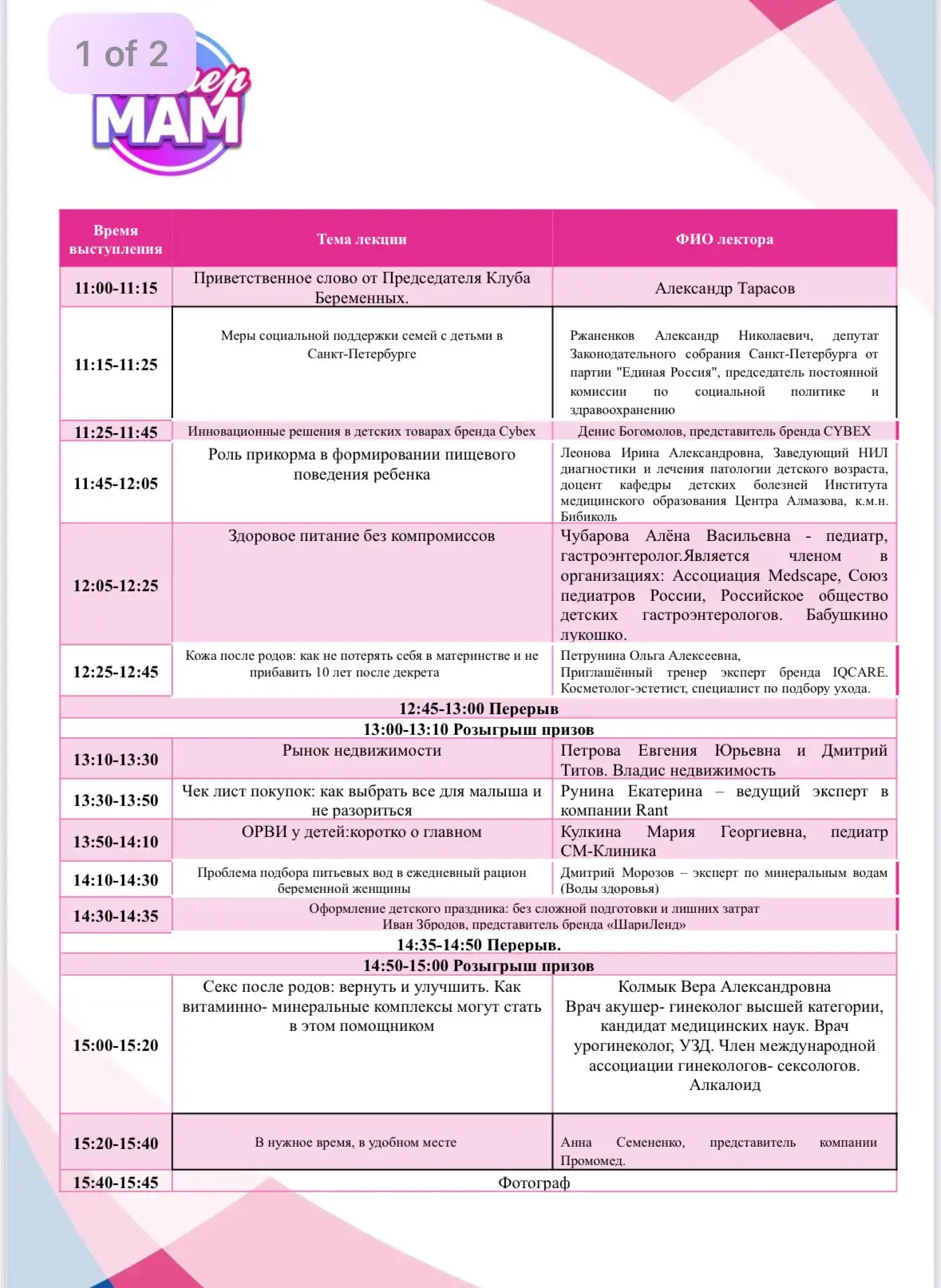 | 21 и 22 марта в гостинице «Октябрьская» в центре Санкт-Петербурга состоялись встречи «Питер, Рожай» и «Питер мам». | | | | Девичники посетили 564 девушки | | | | Аудитория исключительно женщины. | | | | | | На прошлых выходных в Санкт-Петербурге наш Клуб открыл пул весенних мероприятий ярчайшими встречами с огромным количеством как посетителей, так и партнеров. | | | | | | Мини-выставка товаров и услуг | | В мероприятиях принимали участие 19 крупных федеральных компаний России. Во время всего мероприятия работала выставочная зона, на которой можно было посмотреть и протестировать товары для самых маленьких и подробнее узнать о представляемых услугах. Партнеры мероприятия предоставили свою продукцию на стендах мероприятия. | | | | | | Поддержка власти | | С напутственным словом на мероприятии выступил председатель постоянной комиссии по здравоохранению и социальной политике законодательного собрания Санкт-Петербурга Александр Николаевич Ржаненков. Он рассказал о мерах поддержки молодых семей, которые предоставляют городские власти, а также принял участие в гендер-пати! | | | | | | Фотозона | | На фоне пресс-вола гости делали памятные фото | | | | | | Костюмированное шоу участниц | | Наши прекрасные участницы с большим воодушевлением участвовали в тематической вечеринке "Цветущий сад"! | | | | | | Подарочный пакет участницы | | Все посетительницы мероприятия получали пакет участницы в конце лектория с продукцией от партнеров. | | | | | | Общий призовой фонд мероприятия | | На праздничных девичниках был разыгран крупнейший призовой фонд, предоставленный многочисленными партнёрами Клуба беременных и молодых мам. Без индивидуального подарка встречу не покинула ни одна участница. | | | | | | | Подарочный стол Клуба беременных | | | | | | Подарочный стол Клуба молодых мам | | | | Рады нашему сотрудничеству! | | | | | | | Увидеть все наши проекты можно на сайте | | | | | | Отчёты обо всех проектах нашего агентства на нашей платформе в Дзен | | | | | | Все новости о нашей компании и аналитические материалы о рынке детского ритейла | | | | | Календарь активностей 2026 | | | На все вопросы готовы ответить наши представители: | | | |