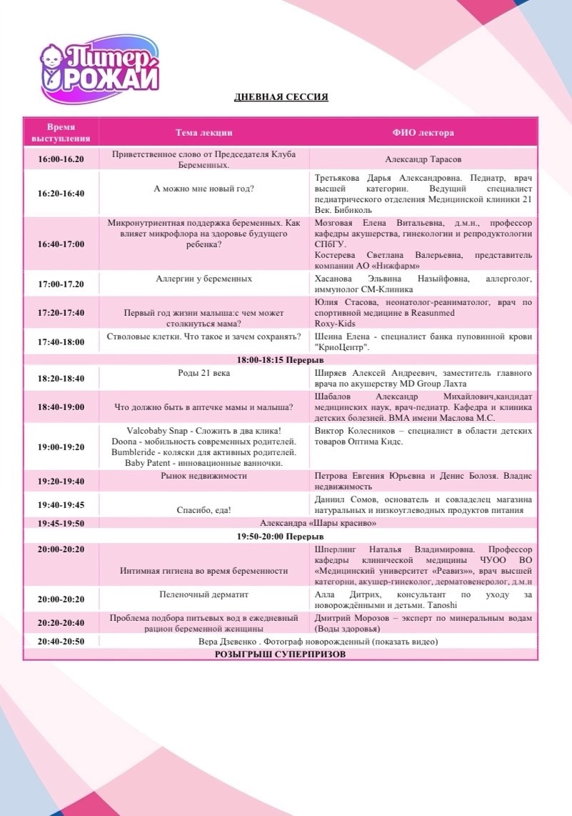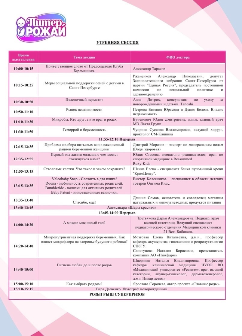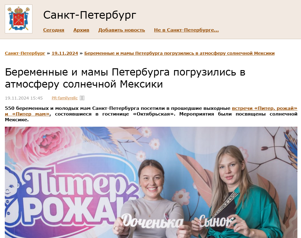 16 и 17 ноября в гостинице «Октябрьская» в центре Санкт-Петербурга состоялись ежемесячные встречи «Питер, Рожай» и «Питер мам». | | | Девичники посетили 547 девушек | | | Мини-выставка товаров и услуг | Во время всего мероприятия работала выставочная зона, на которой можно было посмотреть и протестировать товары для самых маленьких и подробнее узнать о представляемых услугах. Партнеры мероприятия предоставили свою продукцию на стендах мероприятия. | | | | Работа со СМИ – одно из важнейших направлений нашей деятельности. Каждое наше мероприятие освещается профильными изданиями. | | | | Поддержка власти | С напутственным словом на мероприятии выступил председатель постоянной комиссии по здравоохранению и социальной политике законодательного собрания Санкт-Петербурга Александр Николаевич Ржаненков. Он рассказал о мерах поддержки молодых семей, которые предоставляют городские власти. | | | | В мероприятии принимали участие 17 крупных федеральных компаний России. Генеральным партнером наших мероприятий выступает компания Ozon fresh. | | | | Поддержка блогеров | Каждое мероприятие нас поддерживает автор проекта Славные роды Ярослава Сорочева в Санкт-Петербурге. | | | | Фотозона | На фоне пресс-вола гости делали памятные фото | | | | Костюмированное шоу участниц | Наши прекрасные участницы с большим воодушевлением участвовали в тематическом латиноамериканском празднике, и на площадке у нас получилась настоящая Мексиканская вечеринка! | | | | | Именно благодаря нашему дресс-коду у будущих и молодых мам Петербурга появилась возможность раскрыть свою креативность. | | | | Шоу программа | Мероприятие прошло в стиле латино под зажигательные хиты великолепного кавер-бэнда CHILI SANCHOS! | | | | Подарочный пакет участницы | Все посетительницы мероприятия получали пакет участницы в конце лектория с продукцией от партнеров. | | | | Общий призовой фонд мероприятия | На праздничных девичниках был разыгран крупнейший призовой фонд, предоставленный многочисленными партнёрами Клуба беременных и молодых мам. Без индивидуального подарка встречу не покинула ни одна участница. | | | | Рады нашему сотрудничеству! | | | | Подписывайтесь на новости компании в телеграм канале | | | | Увидеть все наши проекты можно на сайте | | | Календарь активностей 2024 | | | Как проходят наши другие мероприятия вы можете посмотреть на нашем канале в Яндекс Дзен | | | На все вопросы готовы ответить наши представители: | | | |