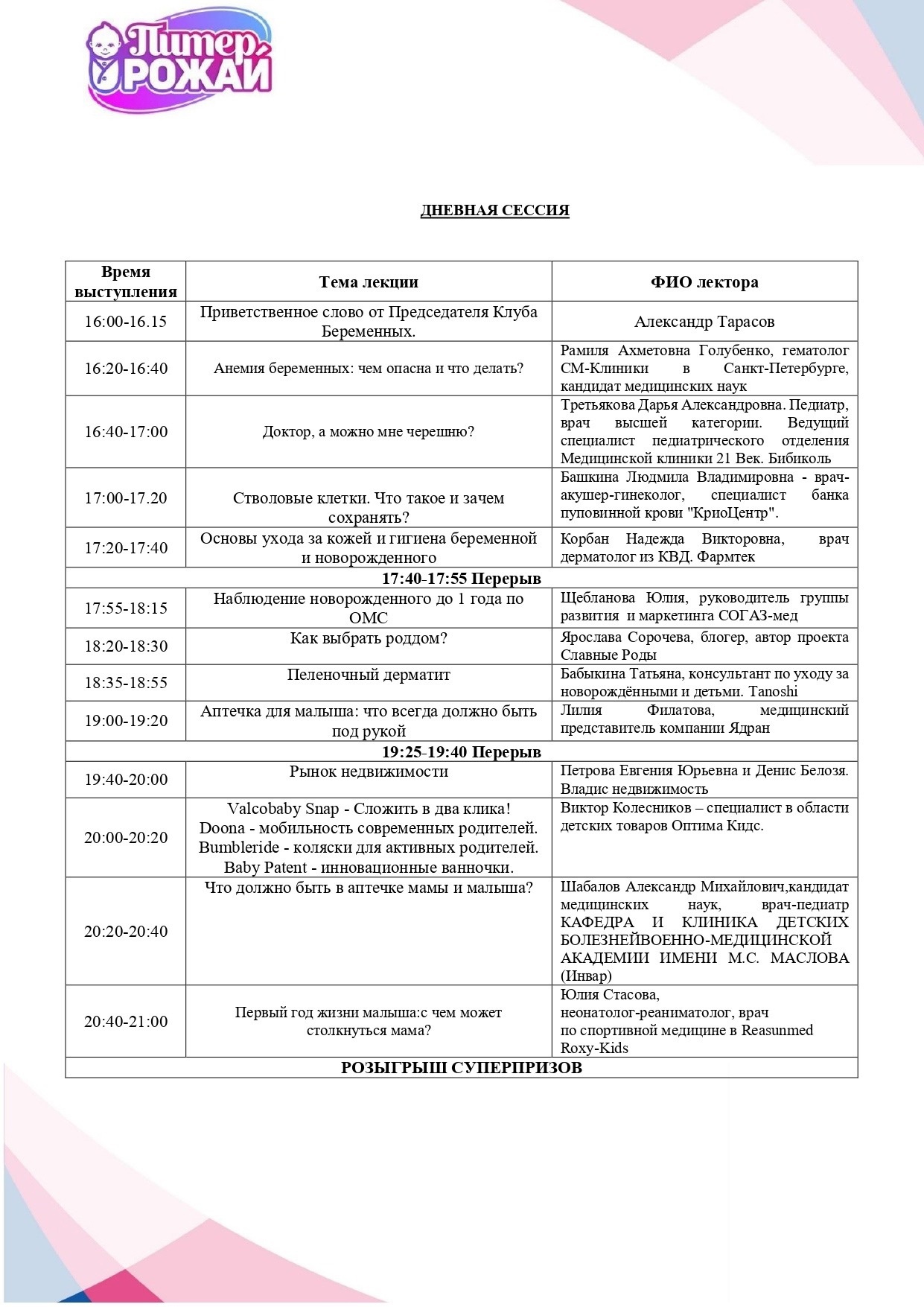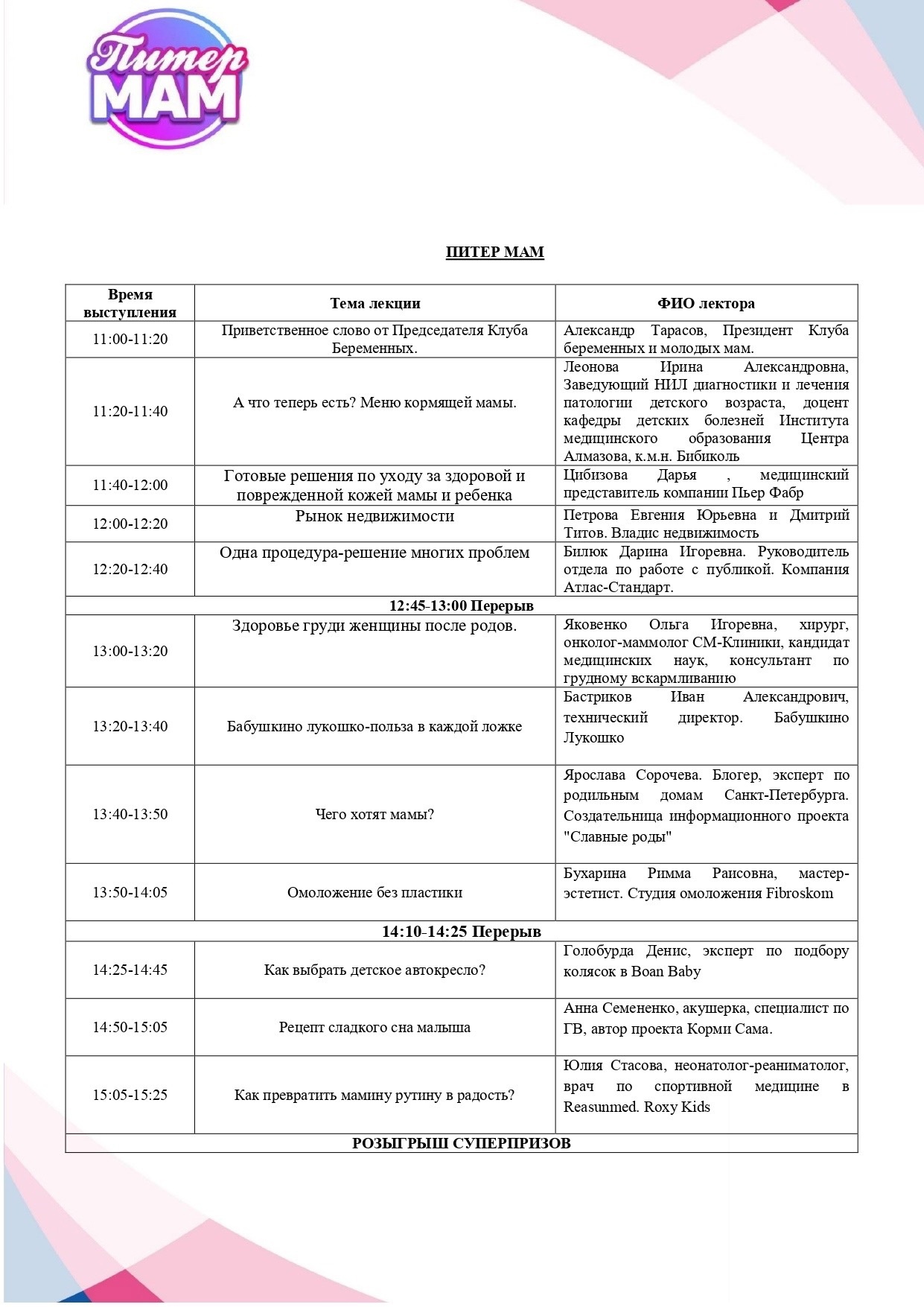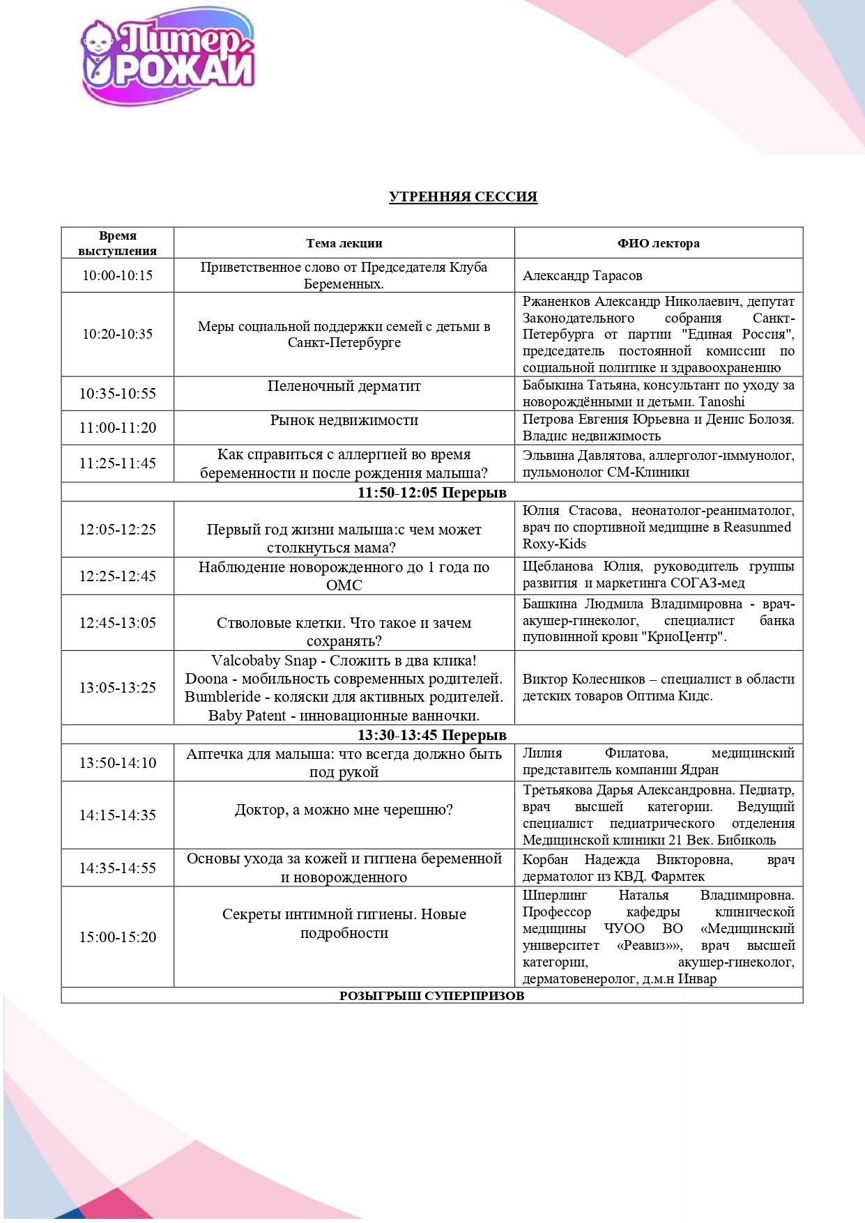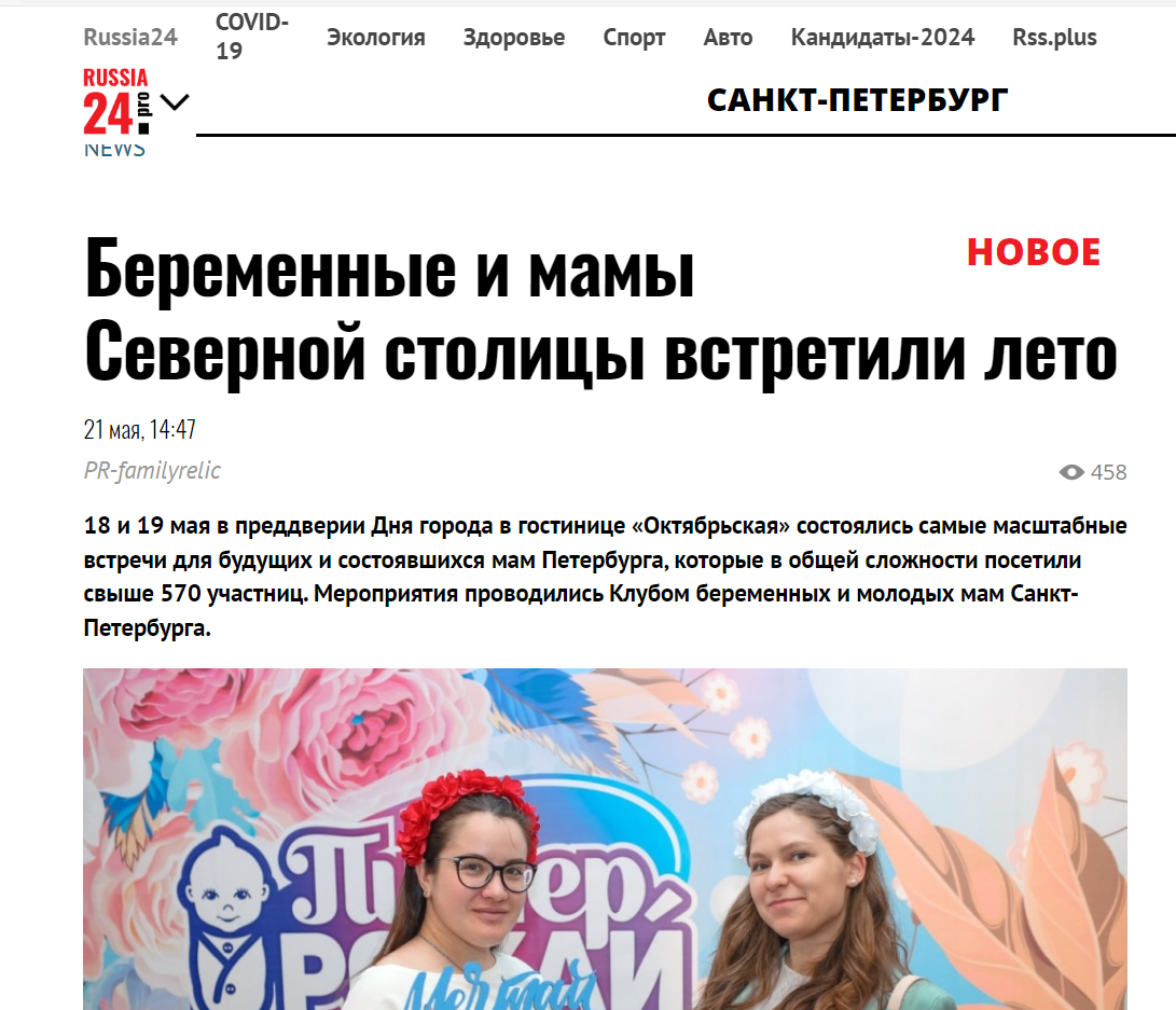 Отчет для партнеров мероприятия | | | | 18 и 19 мая в Санкт-Петербурге прошли грандиозные встречи беременных и молодых мам «Питер, Рожай!» и «Питер мам». | | | Встречи прошли на высочайшем уровне и подарили море положительных эмоций. | | | | Девичники посетили 576 девушек | | | Беременные Санкт-Петербурга встречали лето вместе с нами! | | | | Онлайн аудитория мероприятия | | | | | Сайт | https://devi4nik.ru/piter_rogay | | | Сайт | https://devi4nikmam.club/piter_mam | | | Инстаграм | https://instagram.com/devi4nik.club | | | | Лекторий | Участниц встреч ждало огромное количество актуальных и познавательных лекций, посвящённых процессу беременности, подготовке к рождению ребенка, здоровью мамы и ребенка и уходу за малышом до 1 года. Все лекторы выступили с нестандартными программами и вызвали большой интерес и полное внимание аудитории. | | | | Мини-выставка товаров и услуг | Во время всего мероприятия работала выставочная зона, на которой можно было посмотреть и протестировать товары для самых маленьких и подробнее узнать о представляемых услугах. Партнеры мероприятия предоставили свою продукцию на стендах мероприятия. | | | | Поддержка власти | Депутат Законодательного собрания Санкт-Петербурга Александр Николаевич Ржаненков не пропускает ни одной встречи. Он прочитал лекцию о мерах поддержки, которые город оказывает молодым семьям. | | | | Фотозона | На фоне пресс-вола гости делали памятные фото | | | | Костюмированное шоу участниц | Большинство участниц откликнулись на цветочную тематику мероприятий и подобрали невероятные образы, проявив необычайный креатив и фантазию! | | | | Музыкальная программа | Благодаря приглашенной саксофонистке в зале царила нежная весенняя атмосфера и у всех участниц сохранялось ощущение праздника! | | | | Подарочный пакет участницы | Все посетительницы мероприятия получали пакет участницы в конце лектория с продукцией от партнера | | | | Общий призовой фонд мероприятия | На праздничных девичниках был разыгран крупнейший призовой фонд, предоставленный многочисленными партнёрами Клуба беременных и молодых мам. Без индивидуального подарка встречу не покинула ни одна участница. | | | | По уже сложившейся традиции по итогам мероприятия мы получили солидный набор публикаций от изданий: | | | | Рады нашему сотрудничеству! | | | Подписывайтесь на новости компании в телеграм канале | | | Увидеть все наши проекты можно на сайте | | | Календарь активностей 2024 | | | Как проходят наши другие мероприятия вы можете посмотреть на нашем канале в Яндекс Дзен | | | На все вопросы готовы ответить наши представители: | | | |
