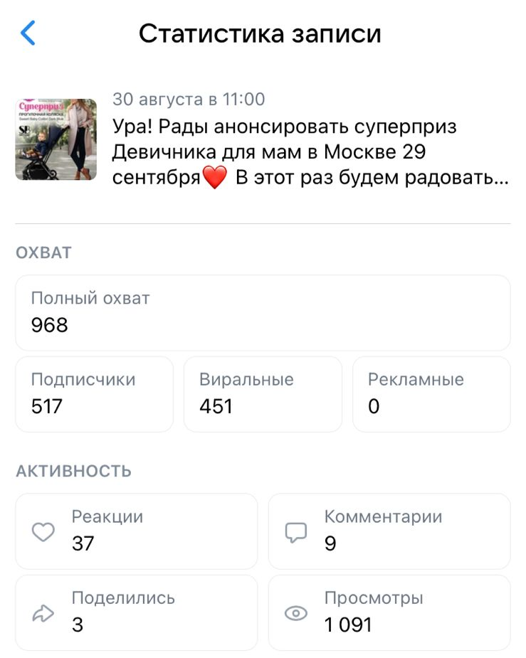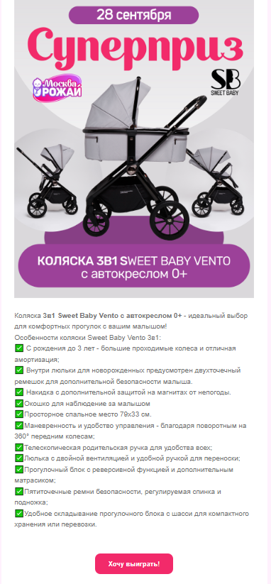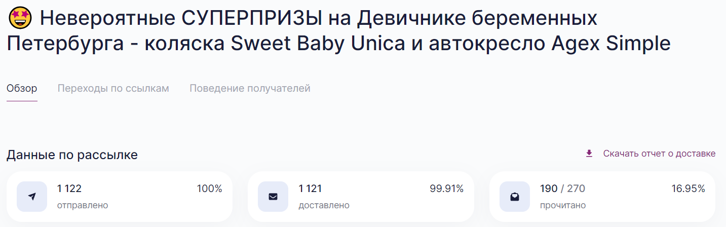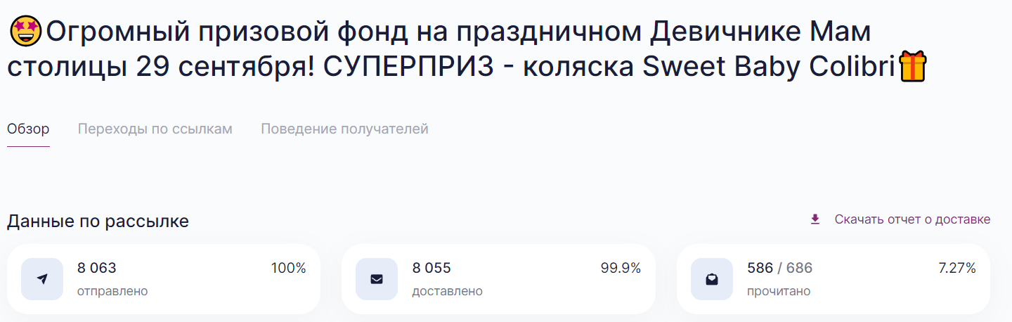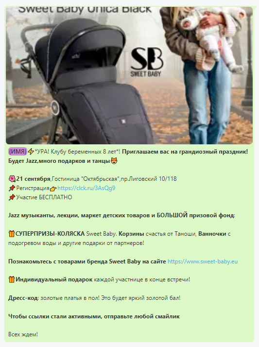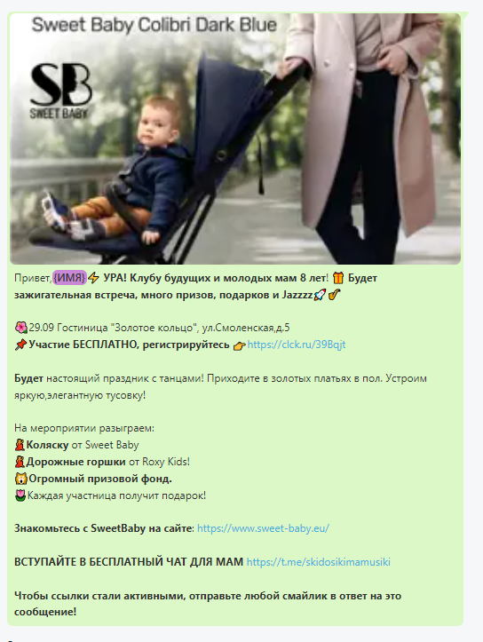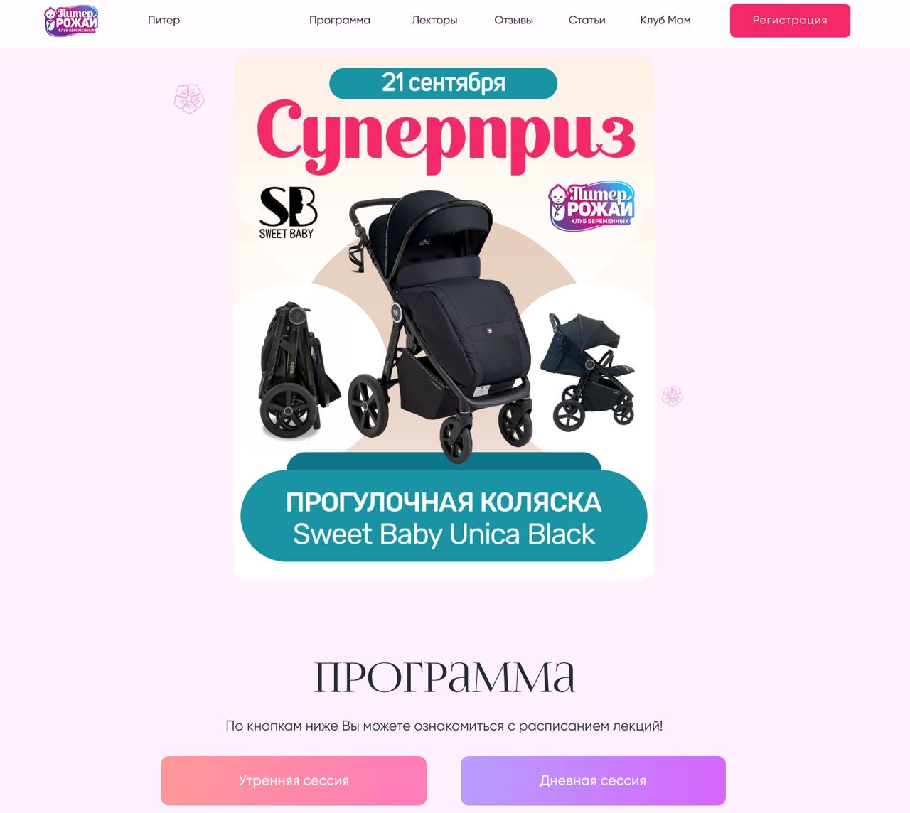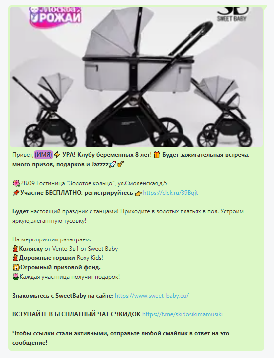 Представляем вашему вниманию отчет о работе, проделанной агентством Club mama в рамках продвижения генерального приза на мероприятиях "Питер, Рожай", "Москва, Рожай", "Москва Мам". | | | | Место проведения: Санкт-Петербург, гостиница «Октябрьская» 4* Дата проведения: 21 сентября 2024 г. Время проведения мероприятия: с 10:00 до 15:00 и с 16:00 до 21:00 (две сессии) Полная посадка | | | | Место проведения: Москва, гостиница "Золотое кольцо" 5* Дата проведения: 28 сентября 2024 г.(Москва, Рожай!), 29 сентября 2024г. (Москва Мам) Время проведения мероприятия: 28.09.24 - с 10:00 до 15:00 и с 16:00 до 21:00 (две сессии). 28.09.24 - с 11:00 до 16:00. Полная посадка в зале в оба дня. | | | | Девичники посетили 786 девушек | | | Публикация постов ВКонтакте в группе Клуб молодых мам с полным суммарным охватом в 2 300: | | | | Рассылка в Telegram c акцентом на суперпризы мероприятий с общим суммарным охватом 10 000 | | | | E-mail рассылки с акцентированием на бренде | | | | WhatsApp рассылка с акцентированием на бренде | | | | | WhatsApp рассылка-приглашение участниц с акцентированием на бренде | | | | | Москва Мам | 1100 контактов | | | | | Питер, Рожай | 1121 контакт | | | Москва, Рожай | 1466 контактов | | | | Посещаемость сайта за время размещения информации о призах. Указаны уникальные пользователи, которые увидели рекламу призового фонда. | | | | Розыгрыш СУПЕРПРИЗА на мероприятии в Петербурге | | | | Розыгрыш СУПЕРПРИЗА на мероприятиях в Москве | | | | Рады нашему сотрудничеству! | | | | Календарь активностей 2024 | | | |