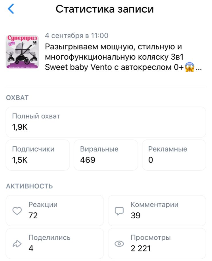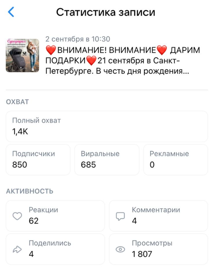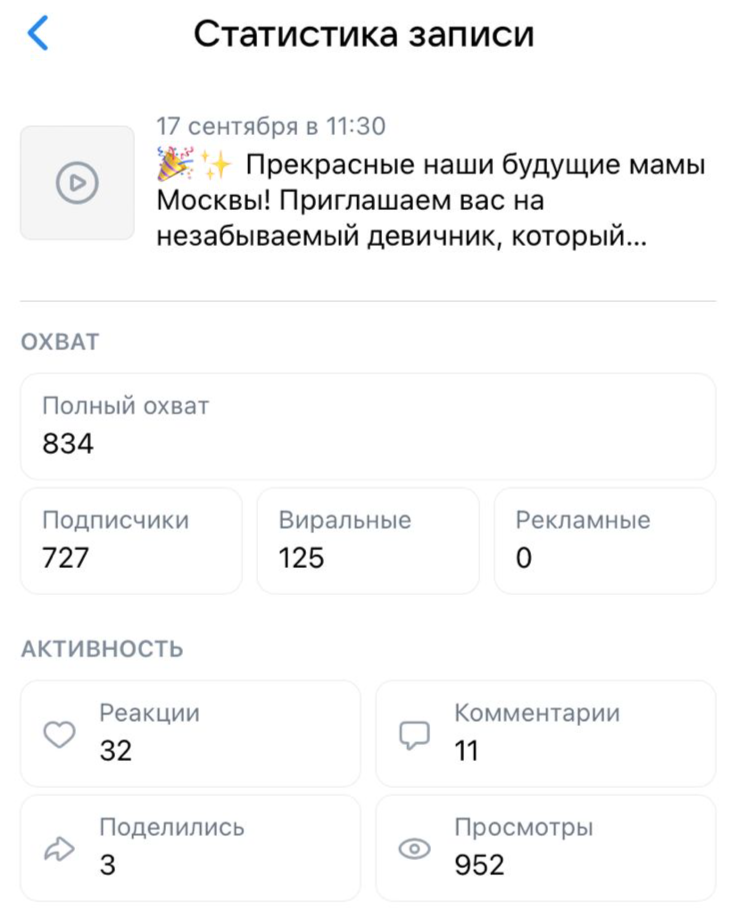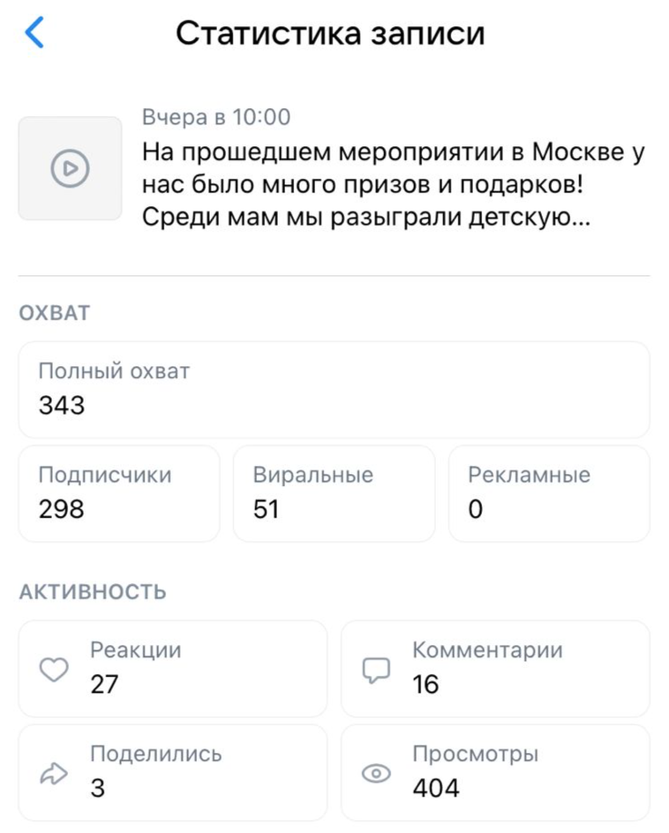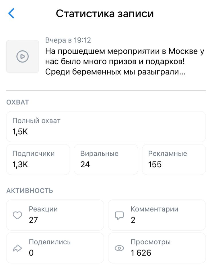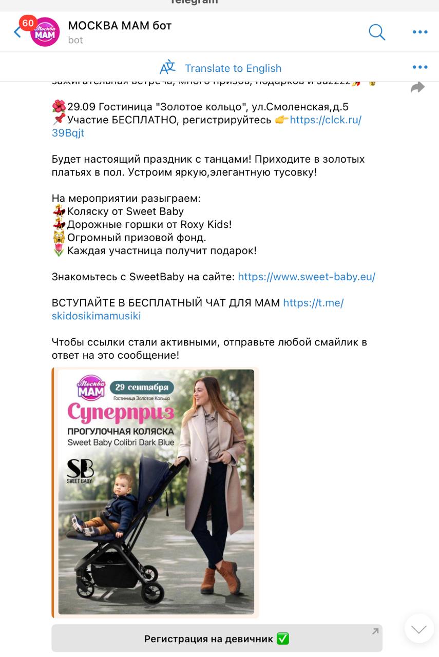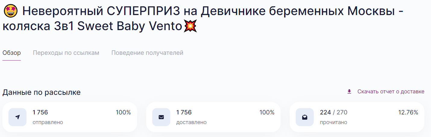 Представляем вашему вниманию отчет о работе, проделанной агентством Club mama в рамках продвижения генерального приза на мероприятиях "Питер, Рожай", "Москва, Рожай", "Москва Мам". | | | | Место проведения: Санкт-Петербург, гостиница «Октябрьская» 4* Дата проведения: 21 сентября 2024 г. Время проведения мероприятия: с 10:00 до 15:00 и с 16:00 до 21:00 (две сессии) Полная посадка | | | | Место проведения: Москва, гостиница "Золотое кольцо" 5* Дата проведения: 28 сентября 2024 г.(Москва, Рожай!), 29 сентября 2024г. (Москва Мам) Время проведения мероприятия: 28.09.24 - с 10:00 до 15:00 и с 16:00 до 21:00 (две сессии). 28.09.24 - с 11:00 до 16:00. Полная посадка в зале в оба дня. | | | | Девичники посетили 786 девушек | | | Публикация постов ВКонтакте в группе Клуб молодых мам с полным суммарным охватом в 2 300: | | | | Рассылка в Telegram c акцентом на суперпризы мероприятий с общим суммарным охватом 10 000 | | | | E-mail рассылки с акцентированием на бренде | | | | WhatsApp рассылка с акцентированием на бренде | | | | | WhatsApp рассылка-приглашение участниц с акцентированием на бренде | | | | | Москва Мам | 1100 контактов | | | | | Питер, Рожай | 1121 контакт | | | Москва, Рожай | 1466 контактов | | | | Посещаемость сайта за время размещения информации о призах. Указаны уникальные пользователи, которые увидели рекламу призового фонда. | | | | Розыгрыш СУПЕРПРИЗА на мероприятии в Петербурге | | | | Розыгрыш СУПЕРПРИЗА на мероприятиях в Москве | | | | Рады нашему сотрудничеству! | | | | Календарь активностей 2024 | | | |
